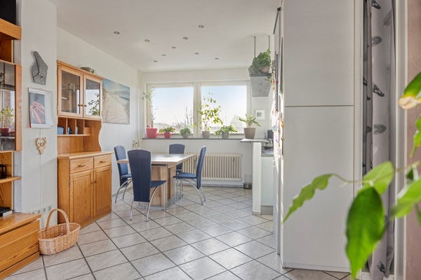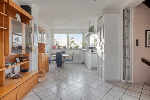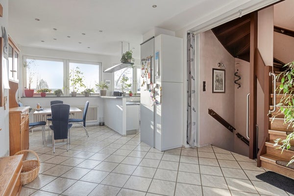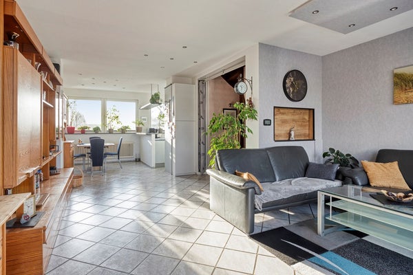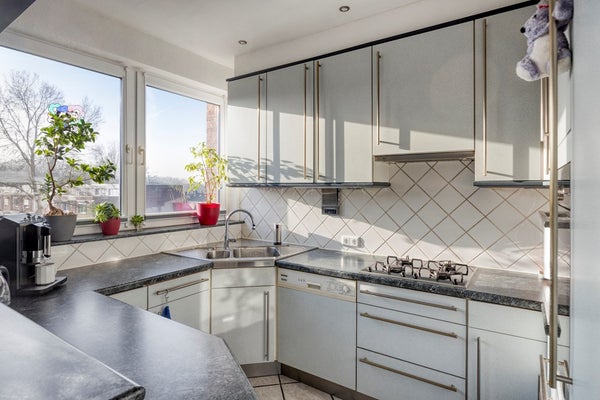 Op de woonverdieping bevindt zich de lichte woonkamer met grote raampartijen, wat zorgt voor een prettige lichtinval. De open keuken sluit hier naadloos op aan en biedt voldoende ruimte voor een eethoek. Een fijne leefruimte waar comfort en functionaliteit samenkomen.