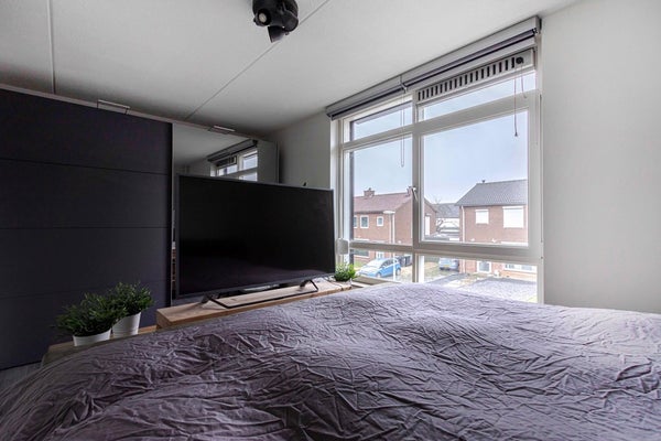 De hoofdslaapkamer bevindt zich aan de voorzijde van de woning en heeft een royale oppervlakte van ruim 13 m². Deze kamer biedt voldoende ruimte voor een groot bed en een kledingkast.