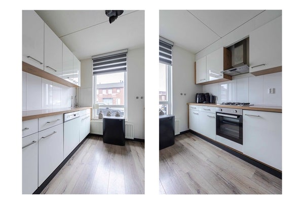 De open keuken staat in directe verbinding met de woonkamer en biedt zicht op de voortuin. De opstelling in twee rechte delen en is uitgerust met een vaatwasser, koelkast, oven, vier-pits gas-kooktoestel en afzuigkap.