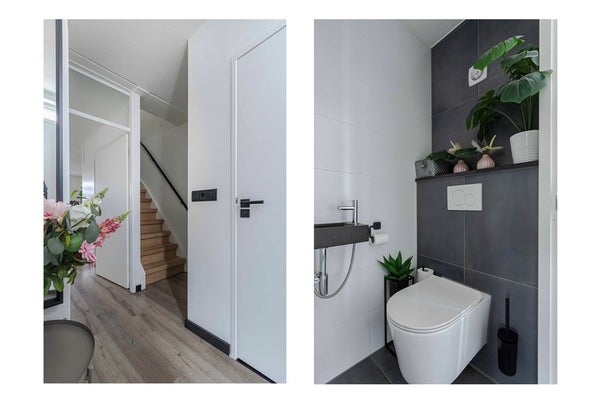 In de hal bevinden zich de meterkast en een modern uitgevoerd, zwevend toilet met fonteintje. Vanuit hier lopen we door naar de woonkamer.