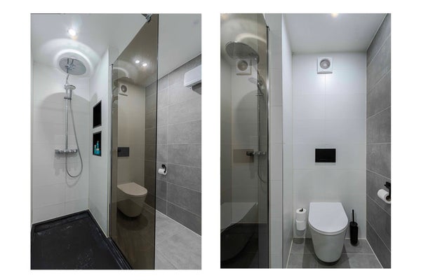Net als de rest van de woning is ook deze verdieping modern en instapklaar afgewerkt. De badkamer, gerealiseerd in 2023, is volledig betegeld en uitgevoerd in neutrale, eigentijdse kleuren. De ruimte beschikt over een comfortabele inloopdouche met regendouche en glazen wand, een tweede toilet en een dubbele wastafel met voldoende opbergruimte. Een stijlvolle en complete badkamer waar comfort en uitstraling samenkomen.