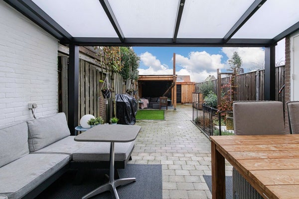 De achtertuin is gelegen op het noordwesten en vormt een fijne plek om van het buitenleven te genieten. Dankzij de aanwezige overkapping kun je hier al vroeg in het voorjaar en tot laat in het najaar comfortabel buiten zitten. Vanuit de tuin is er toegang tot de externe berging, waar zich tevens een tweede opstelplaats voor de wasmachine bevindt. Praktisch en functioneel ingedeeld. De tuin is grotendeels betegeld, wat zorgt voor een onderhoudsvriendelijk geheel, en verkeert – net als de woning – in keurige staat. Een stukje gazon zorgt voor extra sfeer en een groene touch. Achter in de tuin bevindt zich een blokhut met berging van circa 6 m² en daarnaast een fijne overkapping van circa 7,3 m². Bovendien beschikt de tuin over een handige achteringang.