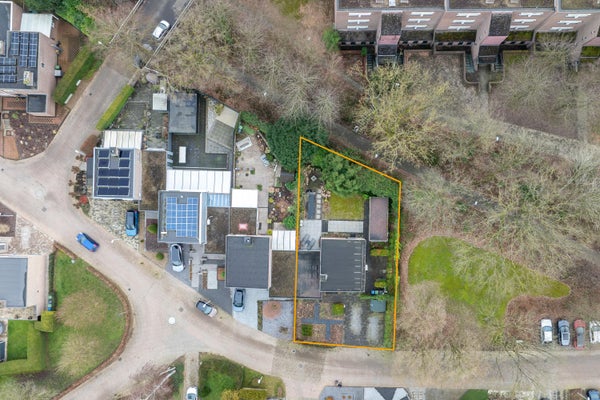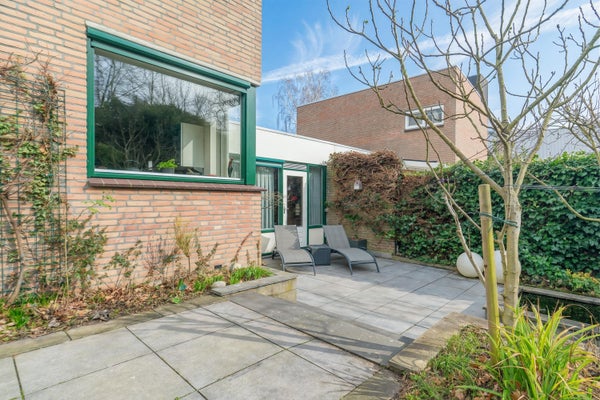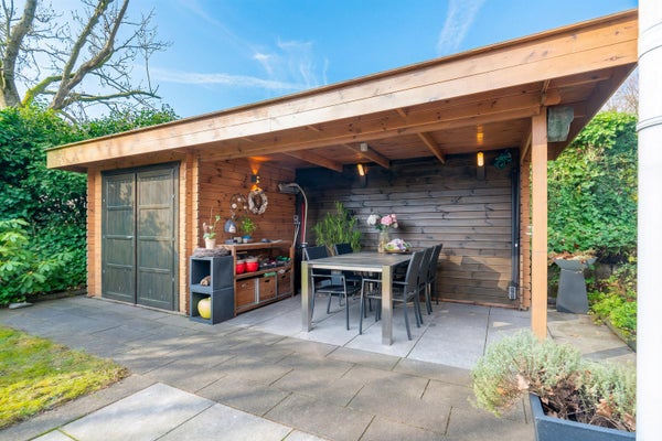 De voortuin is verzorgd aangelegd en beschikt over een praktische houten fietsenberging. Via de zij-ingang is de achtertuin bereikbaar.