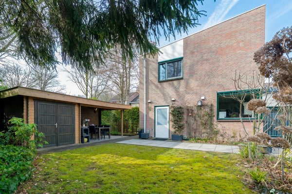 De achtertuin is gelegen op het zuidoosten en biedt volop privacy. Hier vindt u een gazon, een vijverpartij, een beklinkerd pad en een ruime berging met aansluitend een overkapping met terras — een heerlijke plek om te genieten van het buitenleven.