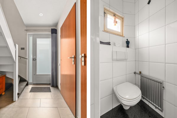 Via de entree bereikt u de ruime hal met meterkast, toiletruimte met hangcloset en vaste trap naar de eerste verdieping. Onder de trap is praktisch gebruikgemaakt van de ruimte met een garderobe.