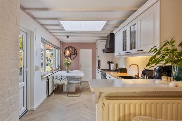 Via de entree met trapopgang en kastruimte bereikt u de ruime woonkamer met aansluitend de eetkamer. De keuken is functioneel opgesteld en biedt toegang tot de overkapping en de tuin.