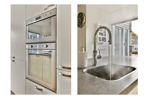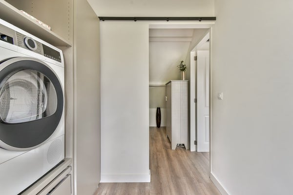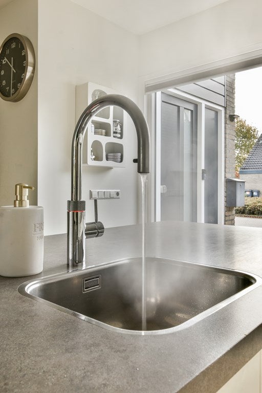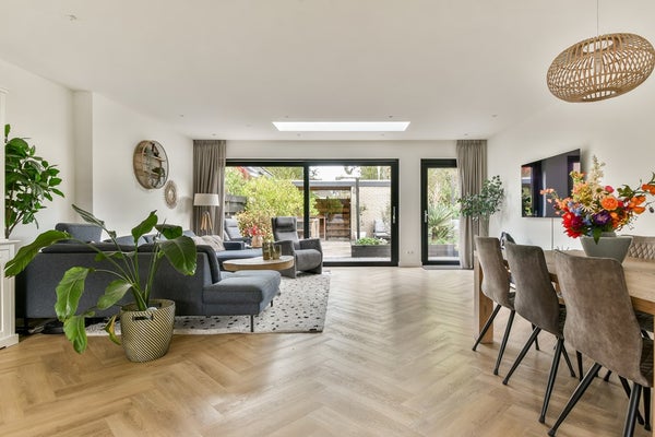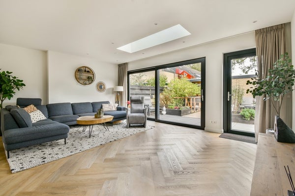 Upon entering the spacious hall, you immediately experience the neat finishing and the warm atmosphere. The living room, extended in 2022, features a chic PVC herringbone floor and underfloor heating and is the heart of the home. The large sliding doors and a skylight ensure an abundance of natural light and an open connection with the modern kitchen, complete with Whirlpool appliances and a Quooker tap.