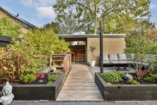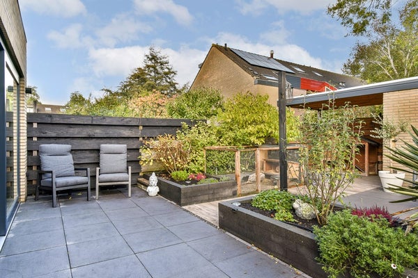 De fraai aangelegde achtertuin op het noord oosten is een oase van rust en privacy. Hier kunt u genieten van lange zomerse avonden, omgeven door groen. De tuin beschikt over een schuur met elektra en een overkapping, ideaal voor extra opslag of als hobbyruimte.