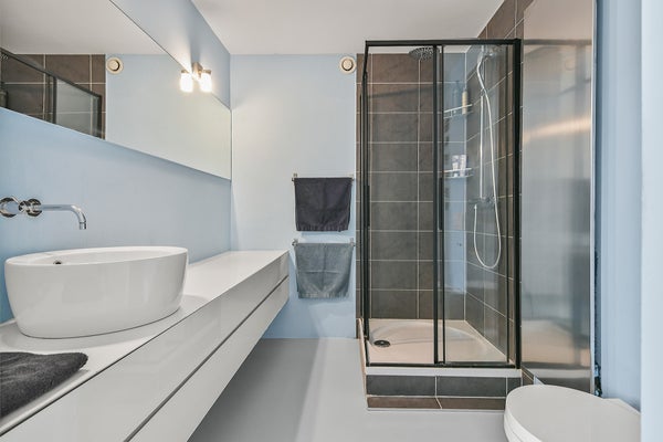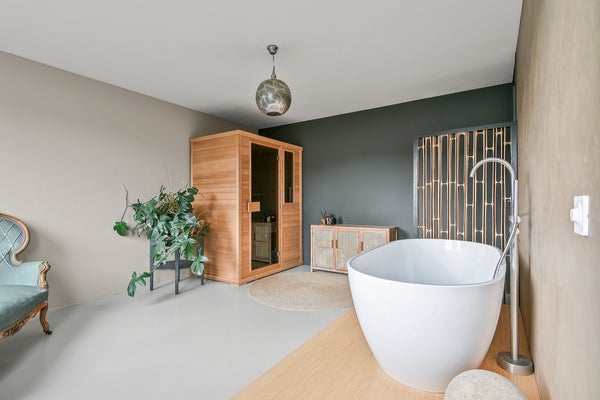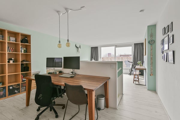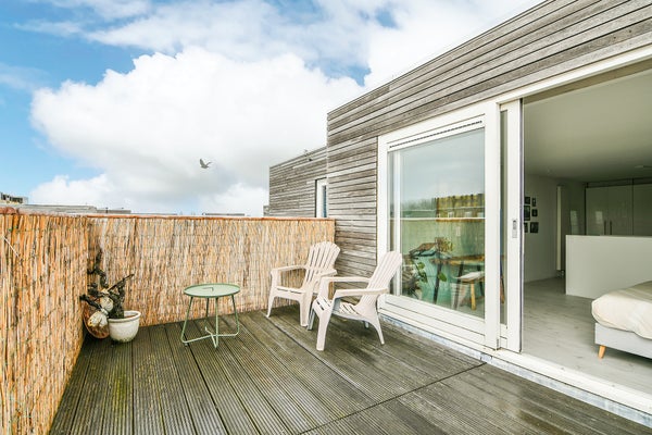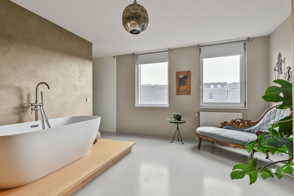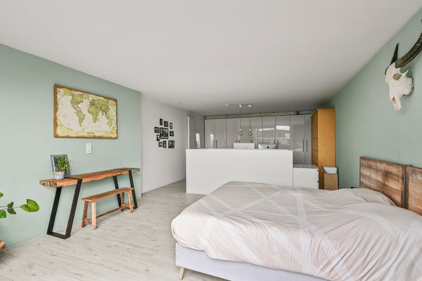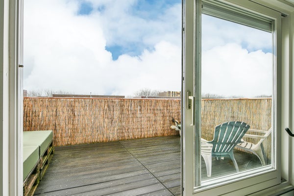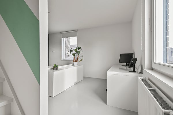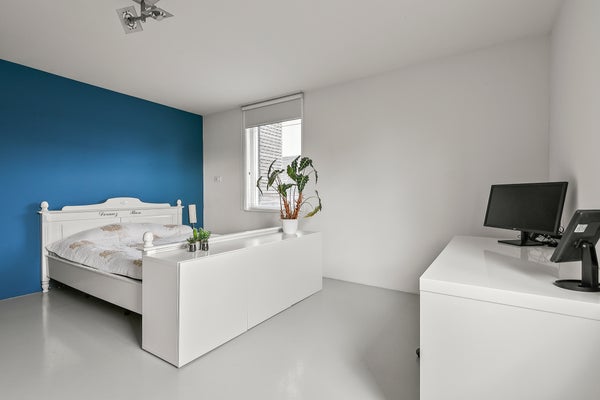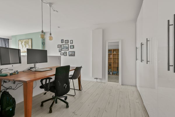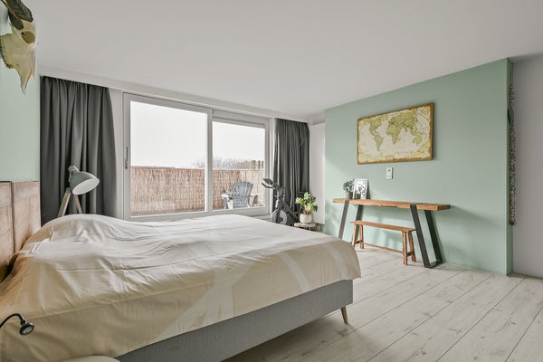 Royale slaapkamer met een vaste kastenwand en volop ruimte voor een werkplek. Vanuit deze kamer is er via een schuifpui toegang tot het op het zuidwesten gelegen dakterras, waar je heerlijk kunt genieten van de middag- en avondzon. Op deze verdieping ligt een laminaatvloer.