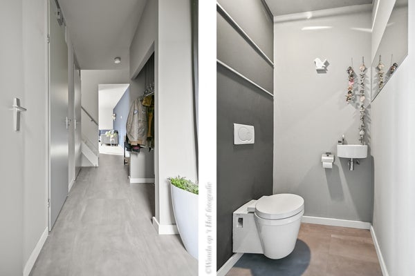 Entree, hal met garderobe, toilet met wandcloset en fontein. Vanuit de hal toegang tot de berging met wasmachineaansluiting.