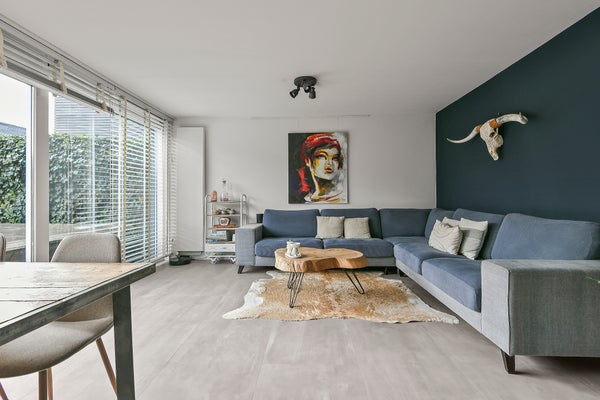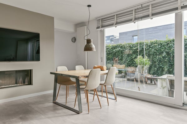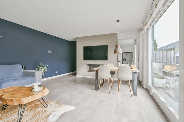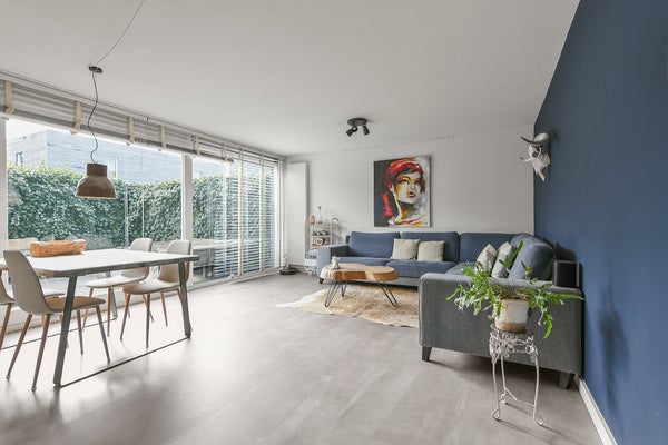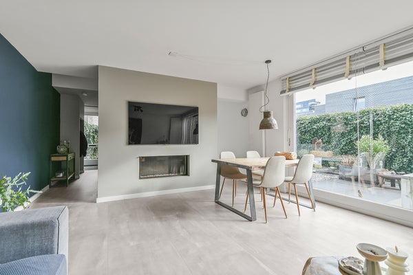 De lichte woonkamer/eetkamer is voorzien van grote raampartijen en een sfeervolle gashaard. Middels een schuifpui is er toegang tot de tuin.