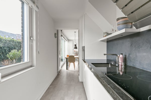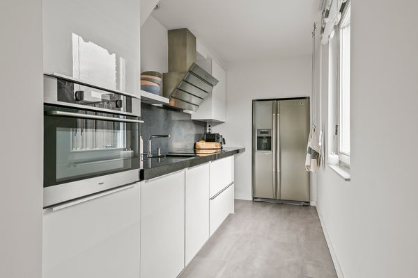 De halfopen keuken is uitgevoerd in hoogglans witte kastjes met een natuurstenen aanrechtblad en beschikt over diverse (inbouw)apparatuur, waaronder een Amerikaanse koelkast, inductiekookplaat, combi-oven, afzuigkap en vaatwasser.