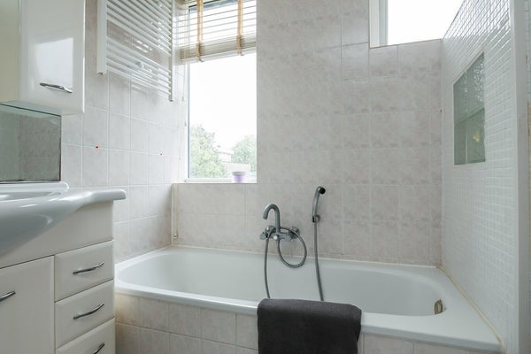 De goed ingedeelde badkamer heeft een ligbad, aparte douche, wastafelmeubel, designradiator en wandcloset. Ook hier weer veel licht door de 2 ramen.