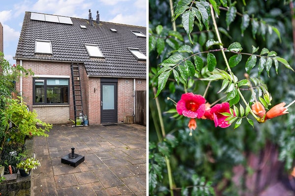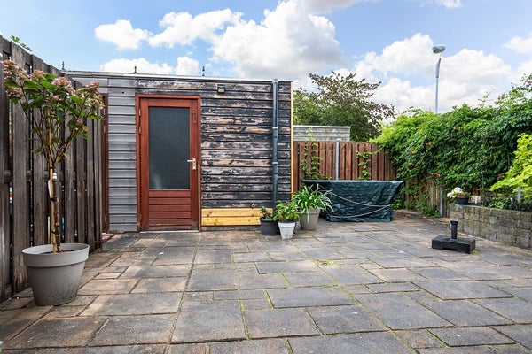 In de achtertuin met handige achterom staat een ruime houten berging voor fietsen en ruimte voor meer.