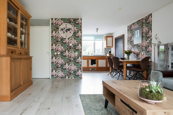 Via de entree komt men binnen in een verrassend lichte en prettig ingedeelde woonkamer met royale raampartij. Hier is ook het trapportaal met toiletruimte. De open keuken aan de achterzijde is compleet met gaskookstel, oven, afzuigkap, combimagnetron en vaatwasser. Ook hier veel lichtinval door de grote ramen met breed uitzicht over de eigen achtertuin. En een prettige extra: een ruime bijkeuken met de koel/vriescombinatie, inbouwkasten en toegang tot de achtertuin.