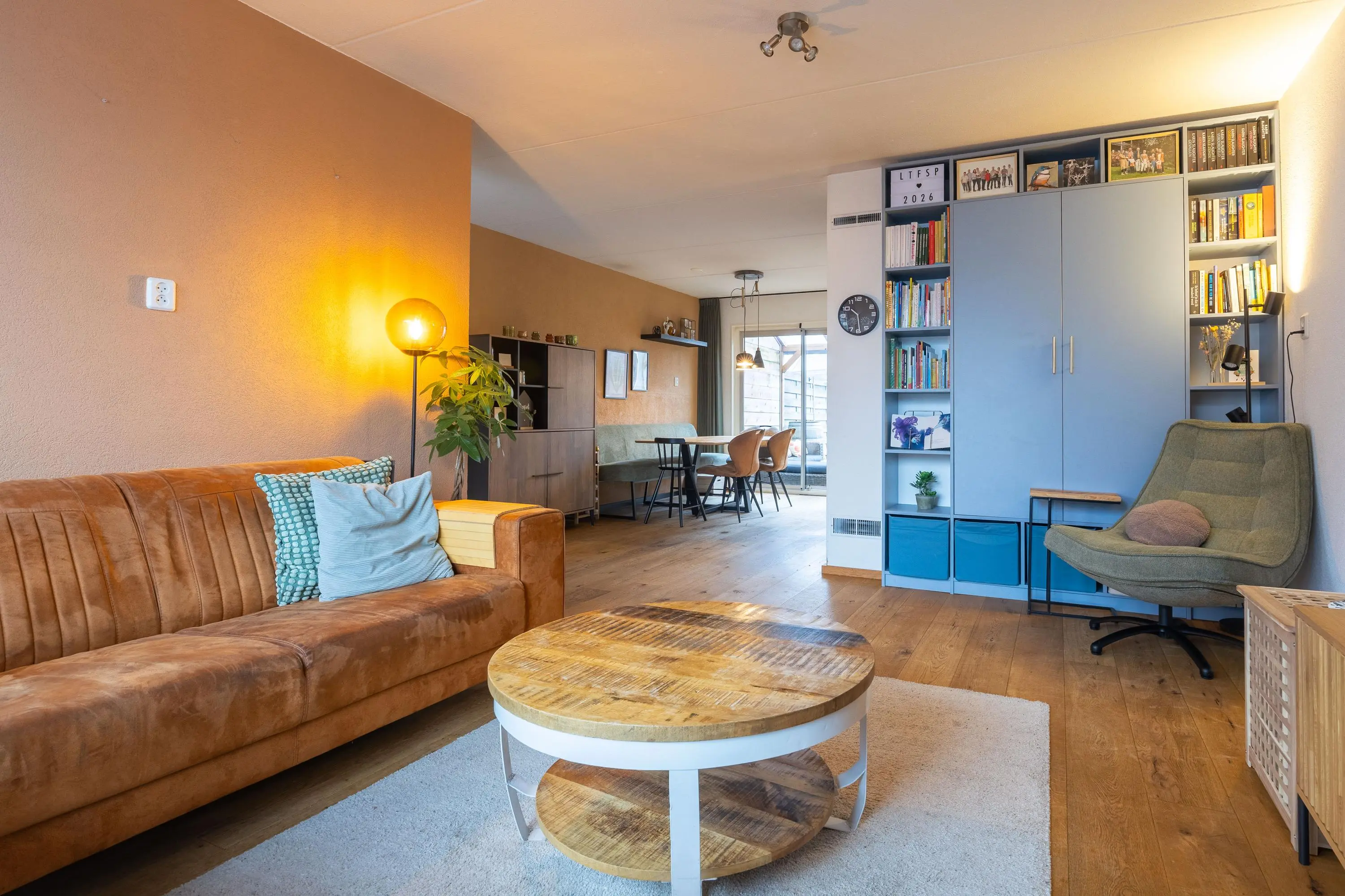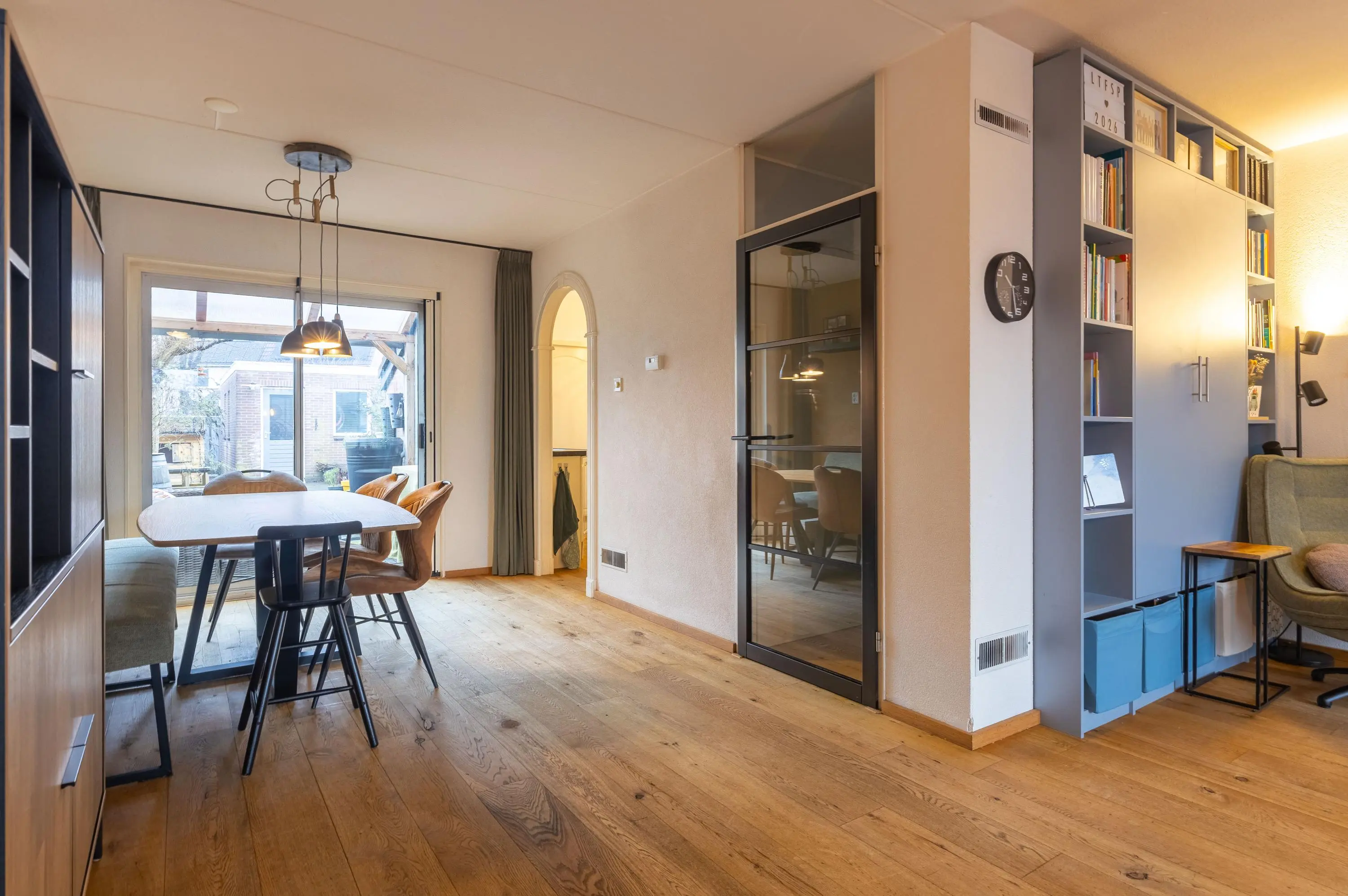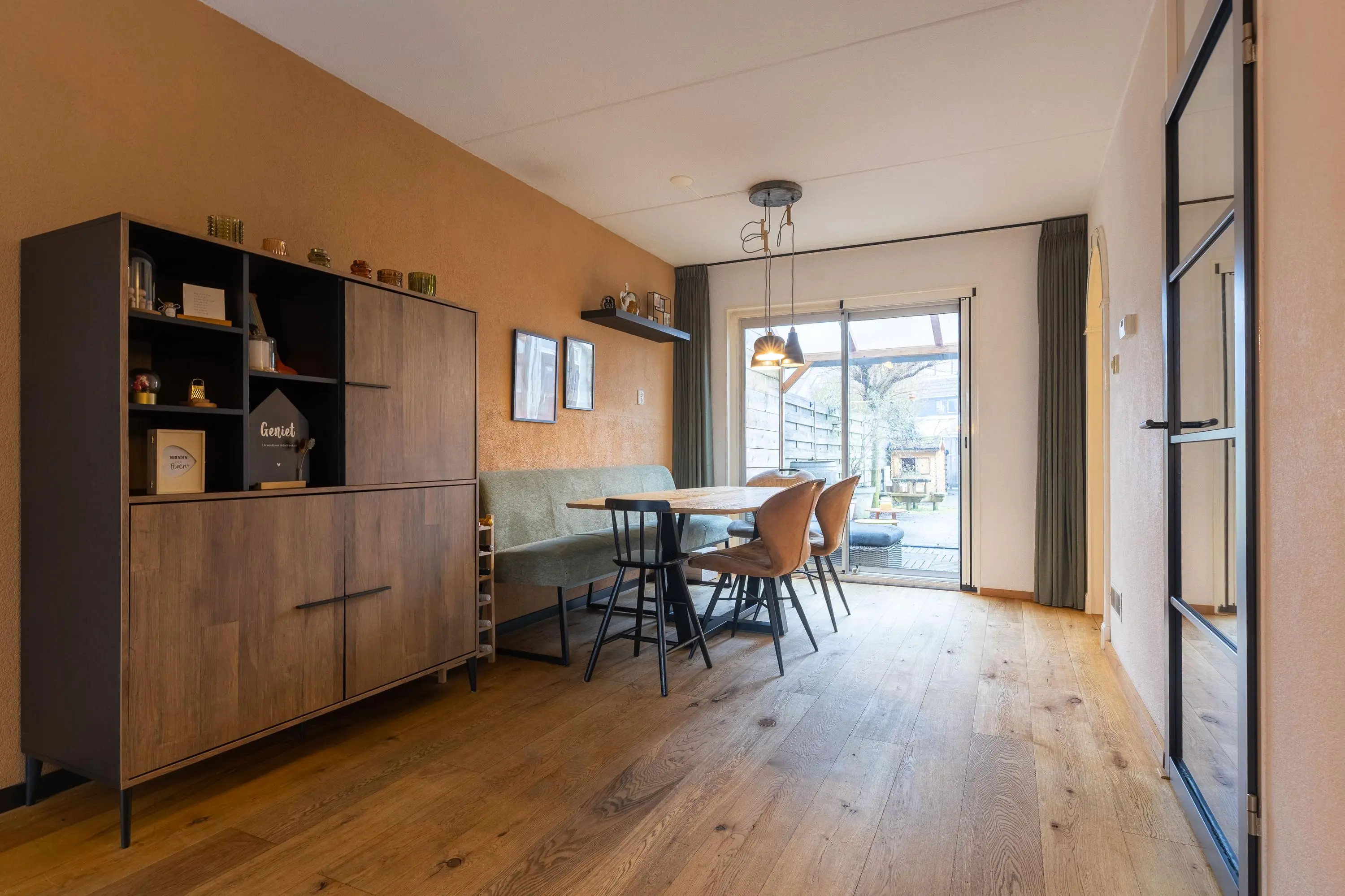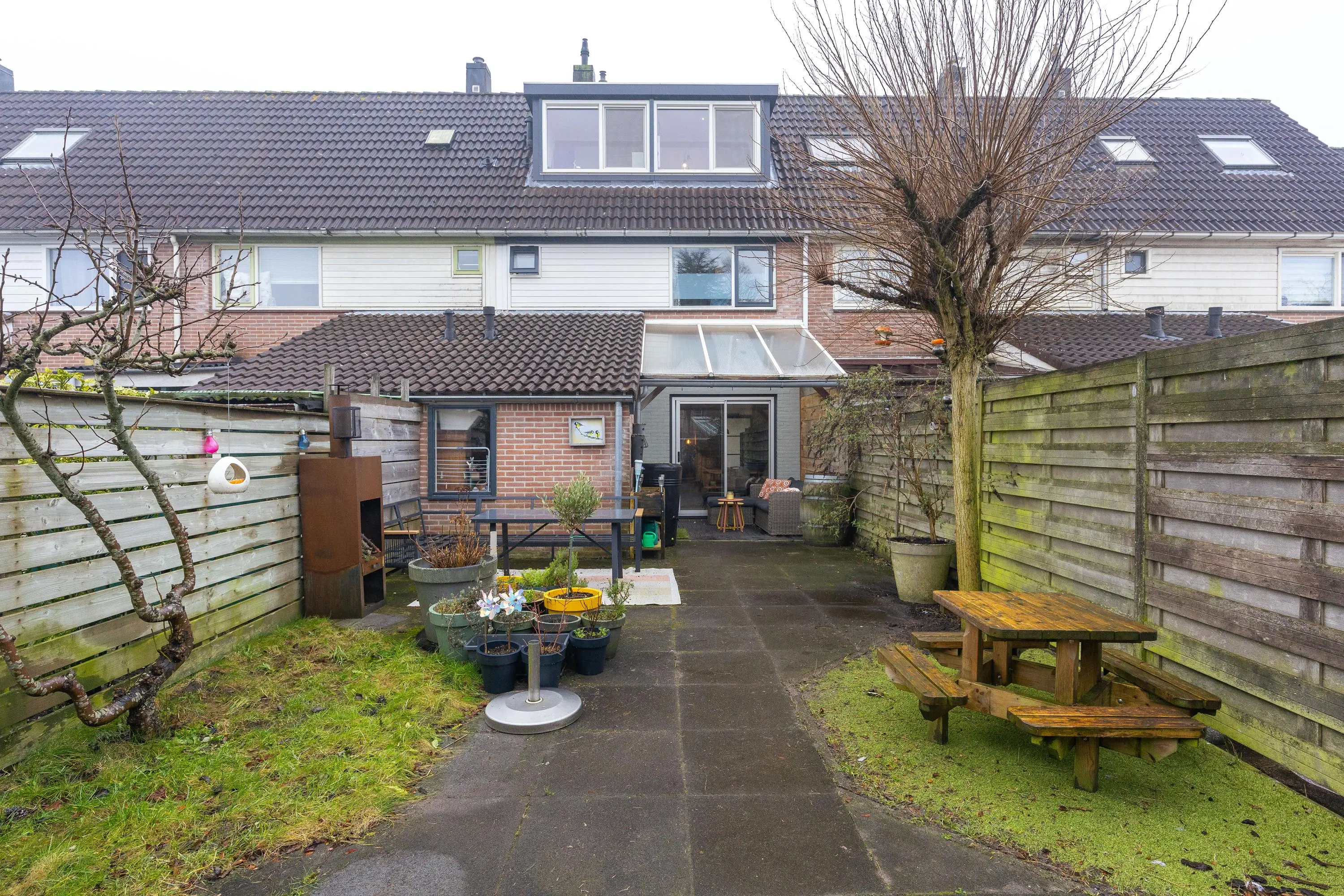 In een rustige en kindvriendelijke omgeving staat deze uitstekend onderhouden gezinswoning met vier slaapkamers. De lichte woonkamer, voorzien van een massief eiken vloer, leidt via een schuifpui naar de aangebouwde veranda, waar binnen en buiten samenkomen. De zonnige tuin op het noordwesten biedt privacy en een fijne plek om te ontspannen, met een ruime vrijstaande stenen schuur voor extra opslag.