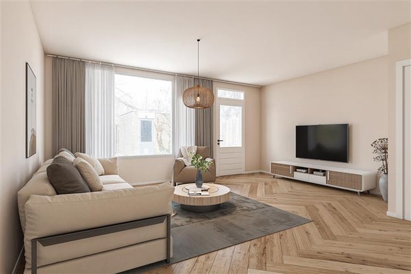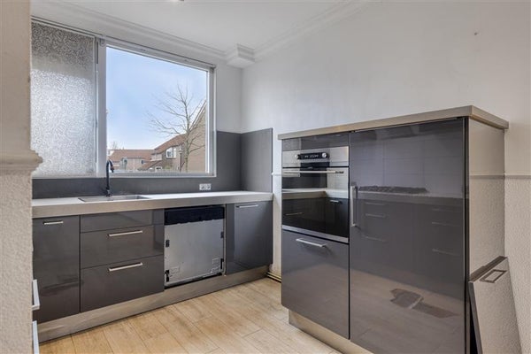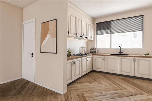 De woonkamer is heerlijk licht dankzij de grote raampartijen. De open keuken is perfect voor de thuischef. Voorzien van een 5-pits gasfornuis, een oven, een vaatwasser met afzuigkap en een spoelbak. Ook is er meer dan genoeg opbergruimte voor al je pannen en kruiden. Extra handig beneden: een diepe trapkast waar je bijvoorbeeld je stofzuiger en voorraad netjes uit het zicht opbergt.