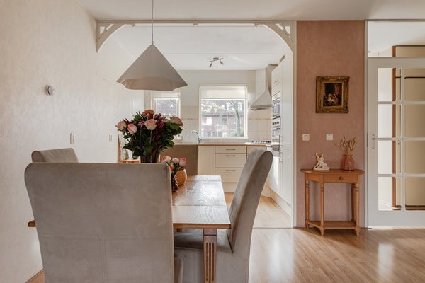 De keuken in lichte kleurstelling is in een hoek geplaatst met lichte wandtegeltjes achter het werkblad. Vanaf het werkblad heeft u zicht op Gemeentegroen en de sloot aan de overkant van de straat dus dat is leuk wegkijken tijdens het kokkerellen en er kan een raam open voor de ventilatie. Naast veel werkblad met 1½ spoelbak is er voldoende bergruimte in de kastjes, laden en de carrouselkast en u treft er de diverse inbouwapparatuur, zoals: een 4 pits gaskomfoor, afzuigkap, vaatwasser, koel/vriescombinatie, groot model heteluchtoven en een separate magnetron.