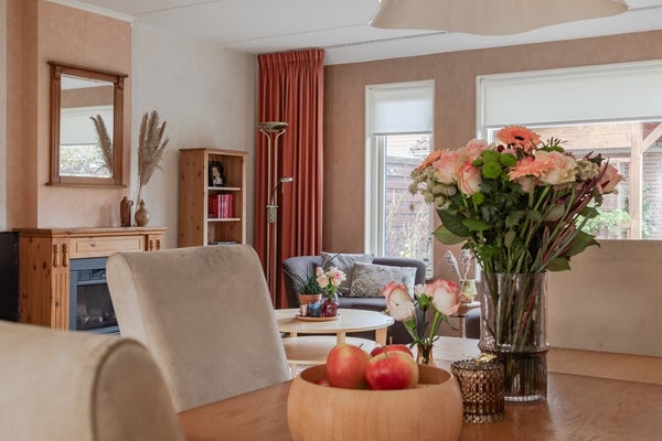 Ruime en brede tuingerichte living waar de lichte Lamett vloer vanuit de hal is doorgelegd. De wanden zijn behangen, er is een praktische trapkast. In een houten ombouw zit een elektrisch sierkacheltje en de living wordt verwarmd door heteluchtverwarming dus geen stoffige radiatoren! Het zijraam kan open voor de natuurlijke ventilatie en dat kan natuurlijk ook door de tuindeur met hor op een kiertje te zetten.