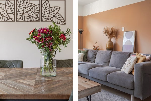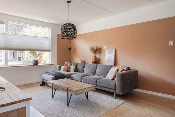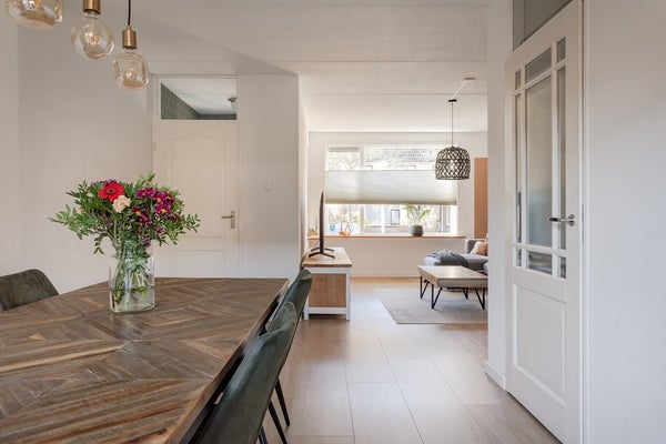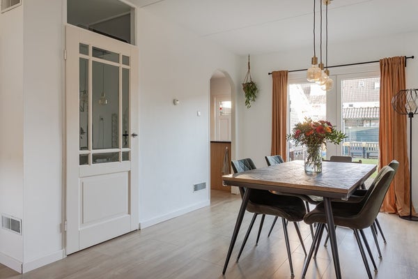 De sfeervolle en trendy living heeft strak gestuukte wanden, op de vloer is een laminaat met brede vloerdelen gelegd en in 2023 zijn de kunststof kozijnen met HR++ glas en ventilatieroosters geplaatst. De ruimte wordt verwarmd door de heteluchtverwarming, dus geen stoffige radiatoren. Bij de eethoek naast de halfopen keuken zijn in 2023 ook kunststof openslaande deuren geplaatst met HR++ glas. Echt een fijne woonruimte voor uzelf, een gezin en om vrienden en kennissen te ontvangen.