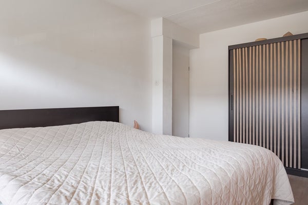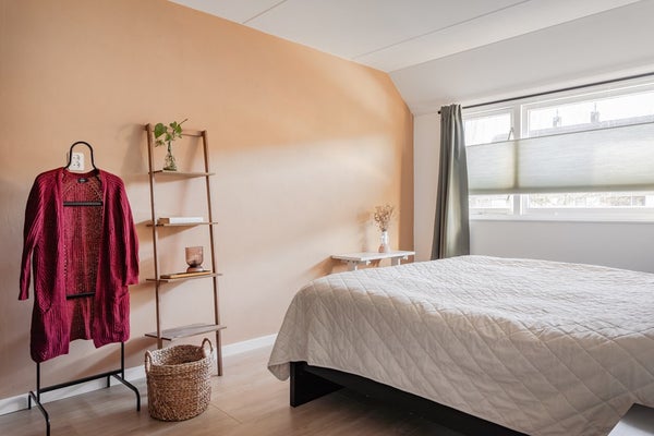 4e Slaapkamer – Ruime kamer waar een laminaatvloer is gelegd, in het houten plafond zitten inbouwspots, er is een vaste kastenwand met schuifdeuren en deze kamer heeft een groot Velux raam met plissé/verduisteringsgordijn, hor en screen aan de buitenzijde.