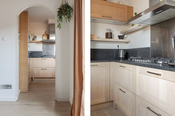 Halfopen keuken, compact maar heel praktisch ingericht! Er is een hoog natuurstenen werkblad met waterkering, 1½ spoelbak, kunststof draai/kiepraam met HR++ glas boven het werkblad, meerdere stopcontacten en veel laden, kastjes, een carrouselkastje en bovenkastje met bladverlichting. Daarnaast ook nog plek gemaakt voor de nodige inbouwapparatuur, zoals: een combimagnetron, separate oven, vaatwasser (2024), koel/vriescombinatie met een 4 laden vriezer, 6 pits gaskomfoor en een rvs-afzuigkap met de afvoer rechtstreeks naar buiten.