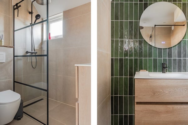 Begin 2025 is deze moderne badkamer in gebruik genomen na een grondige metamorfose. De wanden en vloer zijn modern betegeld, het plafond is gestuukt, inbouwspots verlichten de badkamer en naast het centraal afzuigsysteem is er een uitzetraampje met dubbel glas voor de natuurlijke ventilatie.