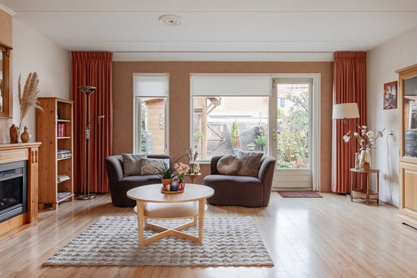 Ruime en brede tuingerichte living waar de lichte Lamett vloer vanuit de hal is doorgelegd. De wanden zijn behangen, er is een praktische trapkast. In een houten ombouw zit een elektrisch sierkacheltje en de living wordt verwarmd door heteluchtverwarming dus geen stoffige radiatoren! Het zijraam kan open voor de natuurlijke ventilatie en dat kan natuurlijk ook door de tuindeur met hor op een kiertje te zetten.