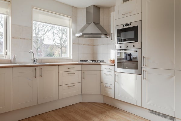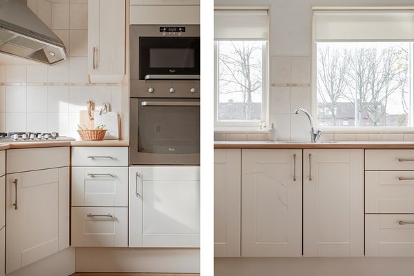 De keuken in lichte kleurstelling is in een hoek geplaatst met lichte wandtegeltjes achter het werkblad. Vanaf het werkblad heeft u zicht op Gemeentegroen en de sloot aan de overkant van de straat dus dat is leuk wegkijken tijdens het kokkerellen en er kan een raam open voor de ventilatie. Naast veel werkblad met 1½ spoelbak is er voldoende bergruimte in de kastjes, laden en de carrouselkast en u treft er de diverse inbouwapparatuur, zoals: een 4 pits gaskomfoor, afzuigkap, vaatwasser, koel/vriescombinatie, groot model heteluchtoven en een separate magnetron.