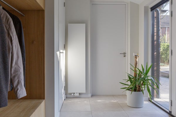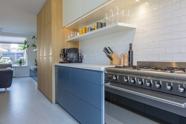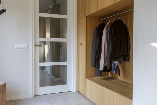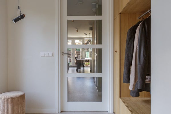 Je betreedt de woning via de ruime entree waar heel veel daglicht komt. Direct vallen de op maat gemaakte kasten goed op en hierdoor krijgt de woning een luxe uitstraling die je niet direct verwacht bij een tussenwoning. Over de details is nagedacht en dat merk je. Via de entree heb je toegang tot het toilet, de garage/berging en de woonkamer met open keuken.