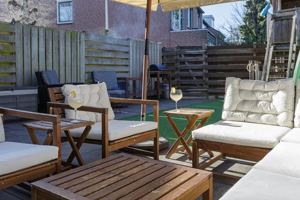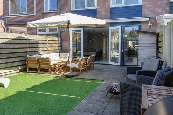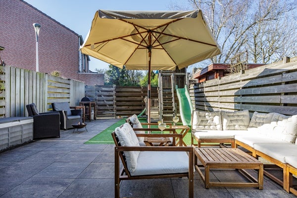 Via de openslaande tuindeuren bereik je de achtertuin. Ook deze is netjes aangelegd en biedt een fijne speelplek voor de kinderen.
