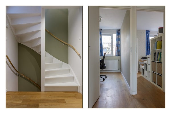 Via de trap bereik je de eerste etage. Deze etage is nier gemoderniseerd. Er bevinden zich drie slaapkamers en een inpandige badkamer. De badkamer beschikt over een bad, douchecabine en dubbelwastafel met meubel.
