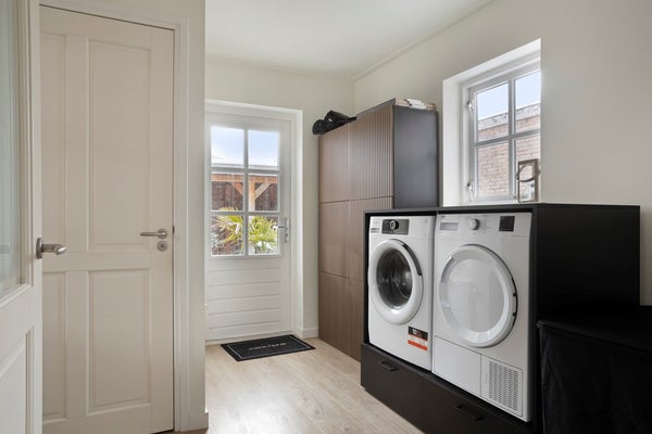 Begane grond: entree/hal met trapopgang, garderobe, half-diepe kelder (v.v. meterkast en glasvezelaansluiting) en deur naar de riante halfopen keuken. Het onder het raam opgestelde kookgedeelte is voorzien van inductiekookplaat (4 zones), design afzuigkap, vaatwasser en voldoende laden-/kastruimte. Daartegenover is een grote keukenkast opgesteld met daarin een combimagnetronoven, koelkast, separate ladenvriezer en veel bergruimte. Doorloop naar de zeer ruime L-vormige living met aan de voorzijde plaats voor een tv-loungehoek en een plek voor een grote eettafel nabij de keuken en de openslaande tuindeuren. In de bijkeuken leiden deuren naar de carport/oprit enerzijds en de achtertuin anderzijds én naar het modern uitgevoerde toilet (voorzien van wandcloset en toiletraam). In de berging zijn de aansluitingen voor wasmachine en –droger te vinden en in een vaste kast bevindt zich de opstelplaats voor de cv-ketel (Vaillant cw5 eco tek, 2023).