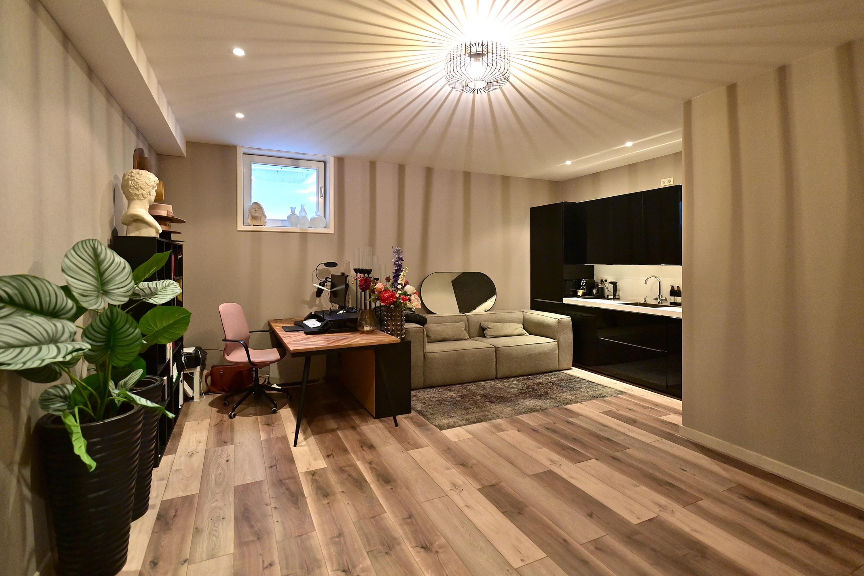 De indeling op de begane grond bestaat uit een hal, woonkamer met open haard en toegang tot de tuingerichte woonkeuken met moderne apparatuur. Het souterrain biedt extra ruimte met een hobbykamer en slaapkamer. De bovenverdieping beschikt over een ruime hoofdslaapkamer met airco en twee extra slaapkamers met kasten. Daarnaast zijn er twee badkamers beschikbaar.