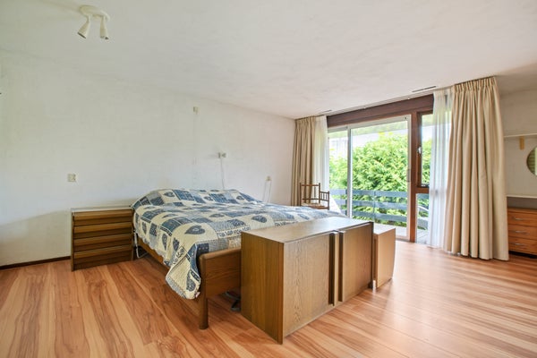 De hoofdslaapkamer beschikt over een schuifpui naar het balkon aan de achterzijde van de woning, een grote kastenwand en directe toegang tot de badkamer. De badkamer is tevens bereikbaar vanuit de hal en is voorzien van een ligbad, aparte douche, tweede toilet, badkamermeubel voor handdoeken en een dubbel wastafelmeubel met spiegelkast.