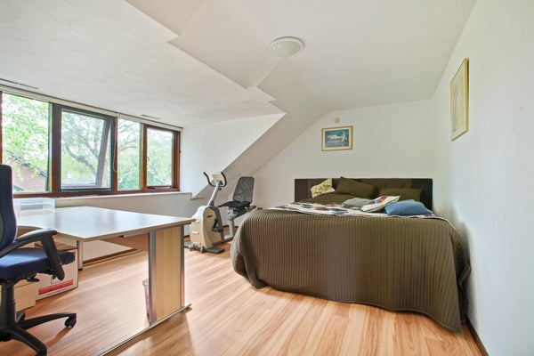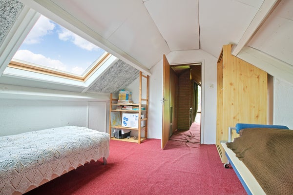 Ruime, lichte overloop, praktische bergkast. Vierde slaapkamer met dakraam.