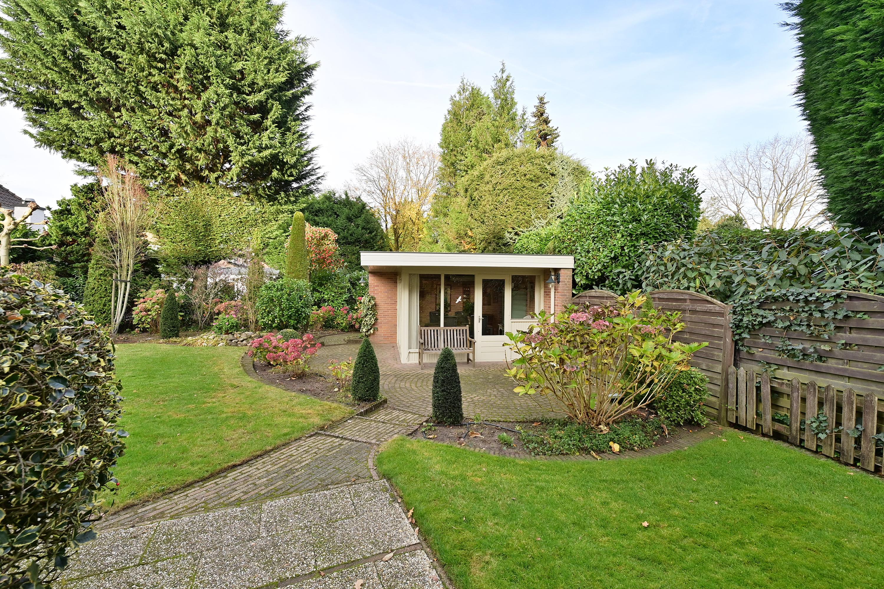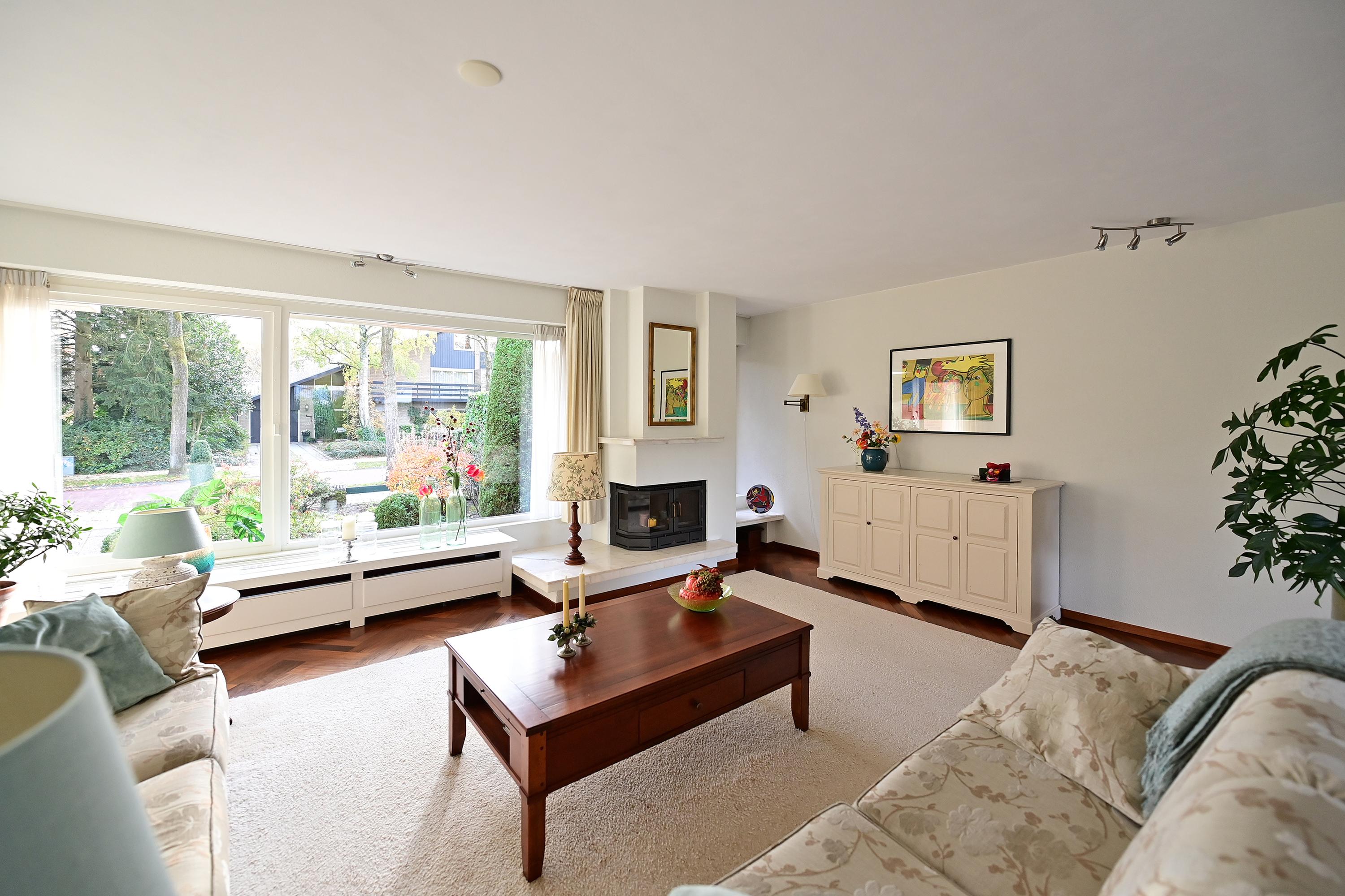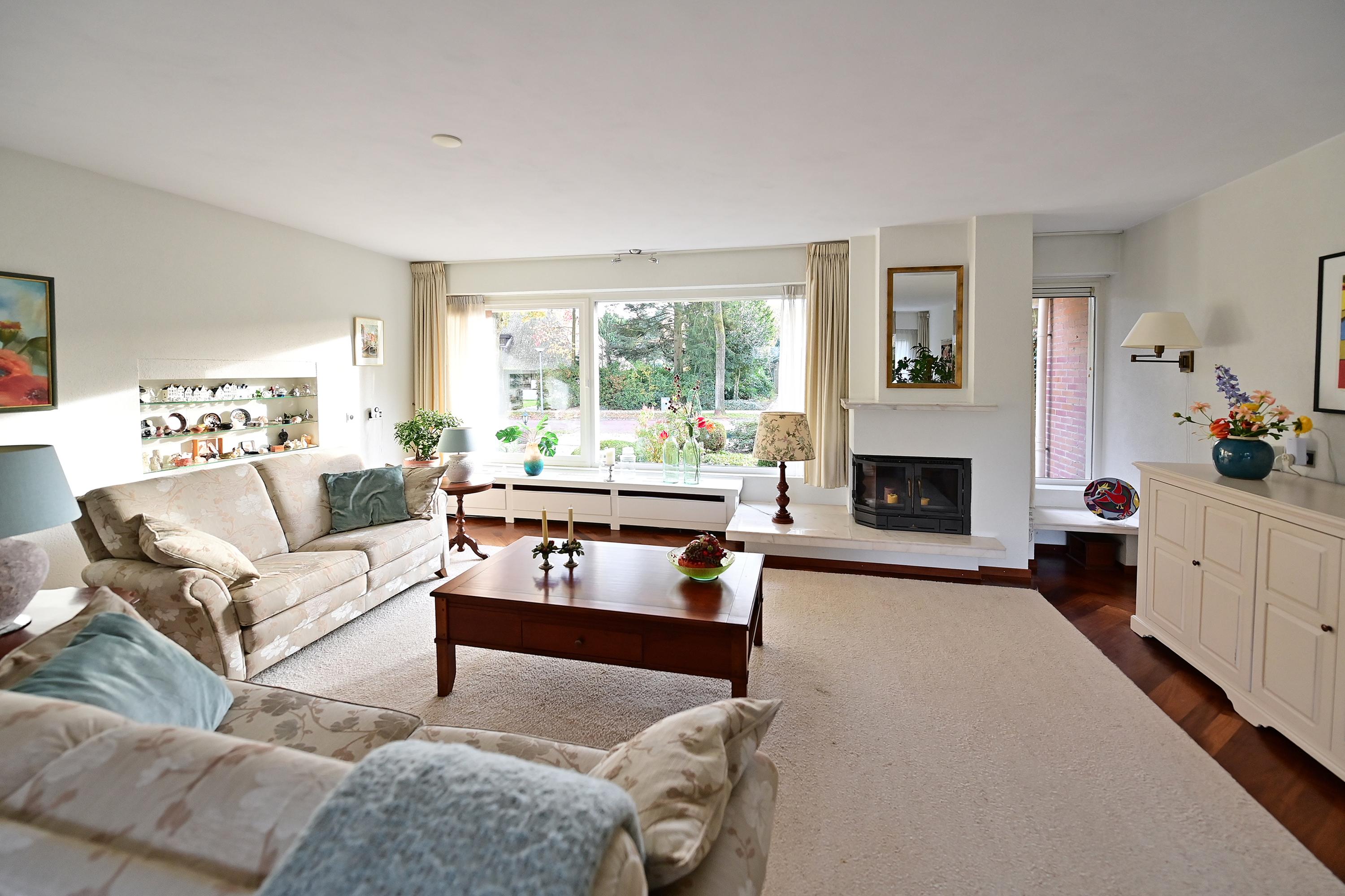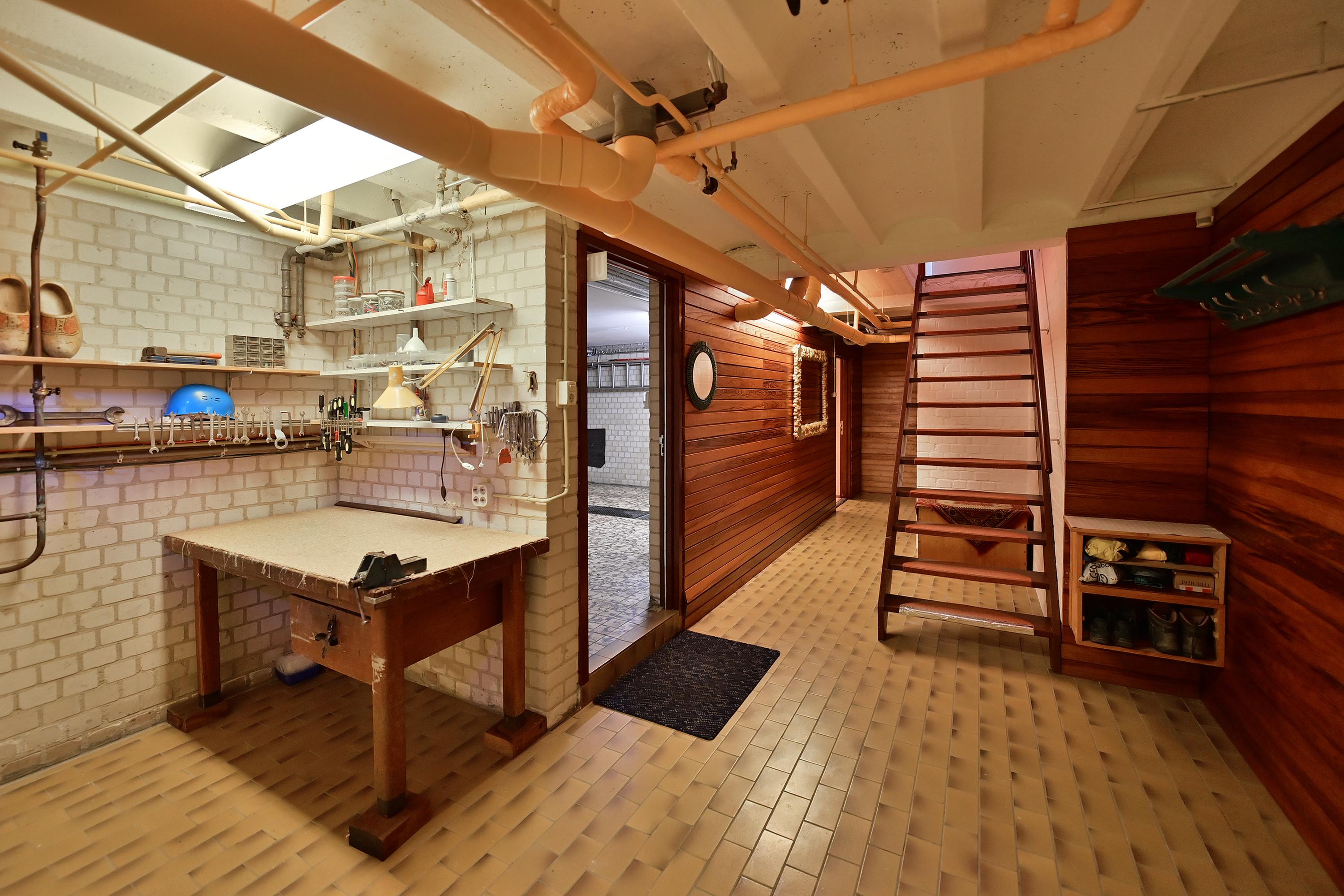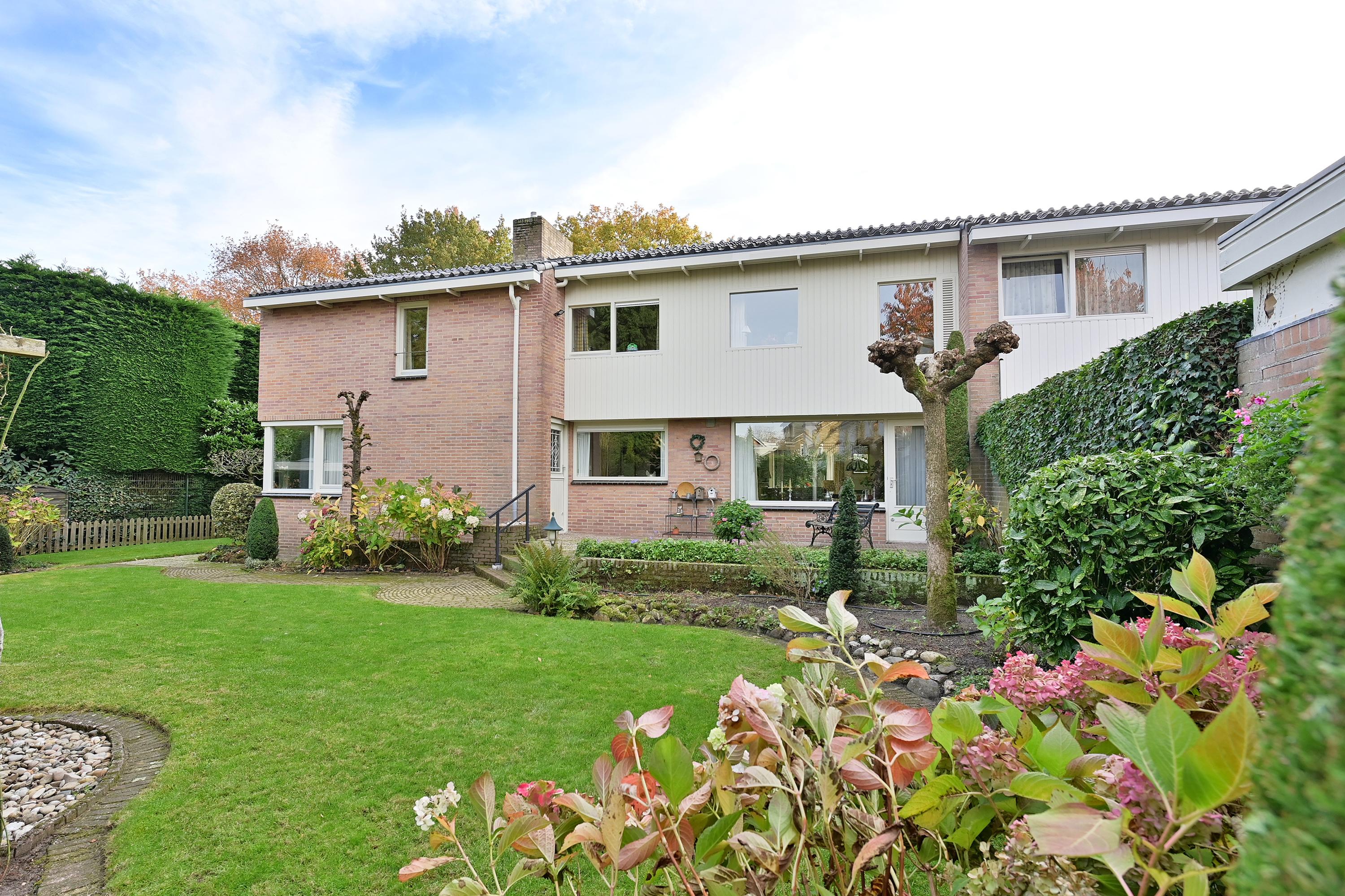 De indeling omvat een ruime hal, lichte woonkamer met open haard, een praktische keuken met bijkeuken en toegang tot de tuin. Er zijn vijf slaapkamers en twee badkamers, en het souterrain bevat een hobbyruimte en garageruimte. De mooi aangelegde tuin met verschillende terrassen biedt privacy en gelegenheid om van het buitenleven te genieten.