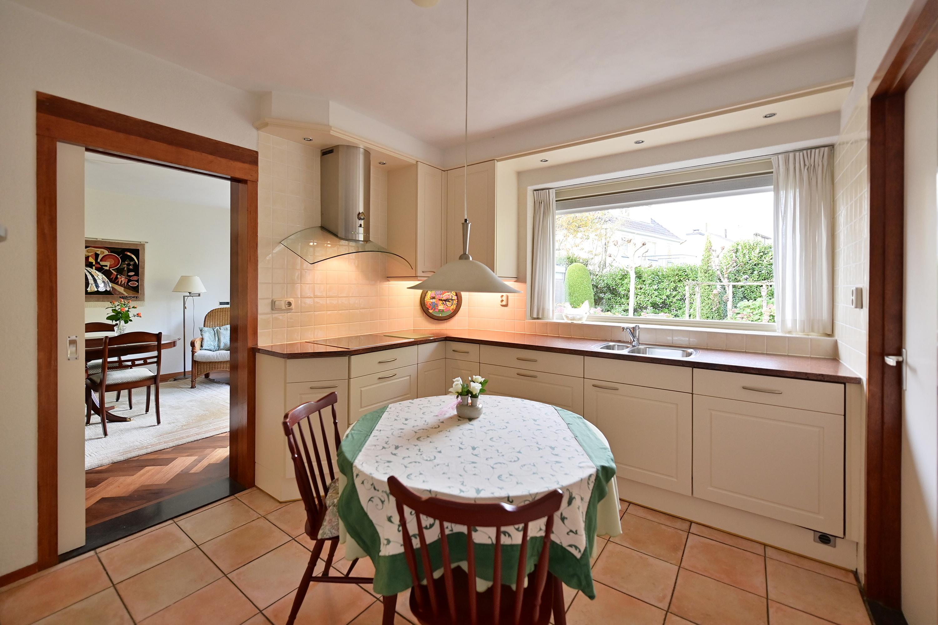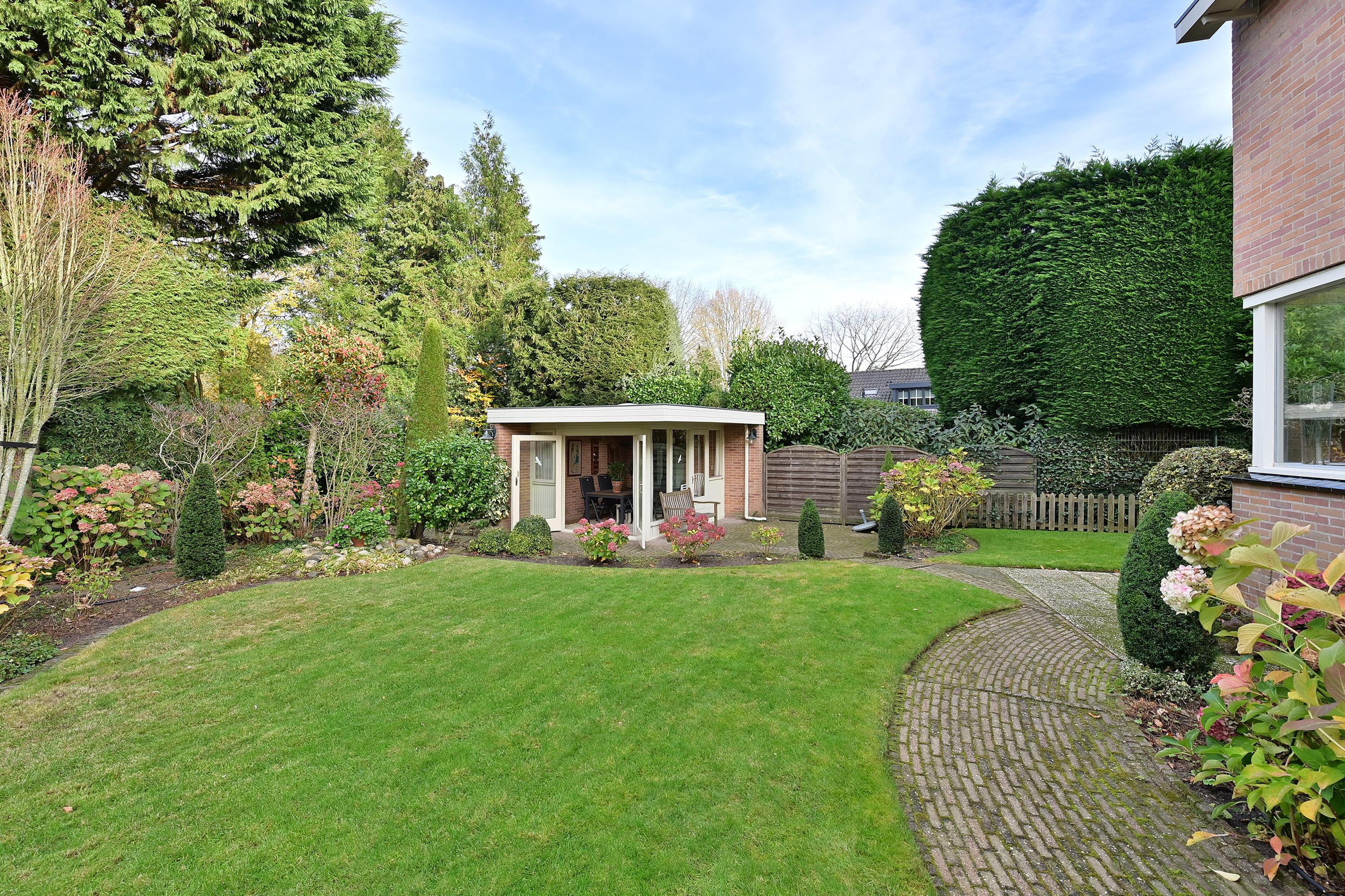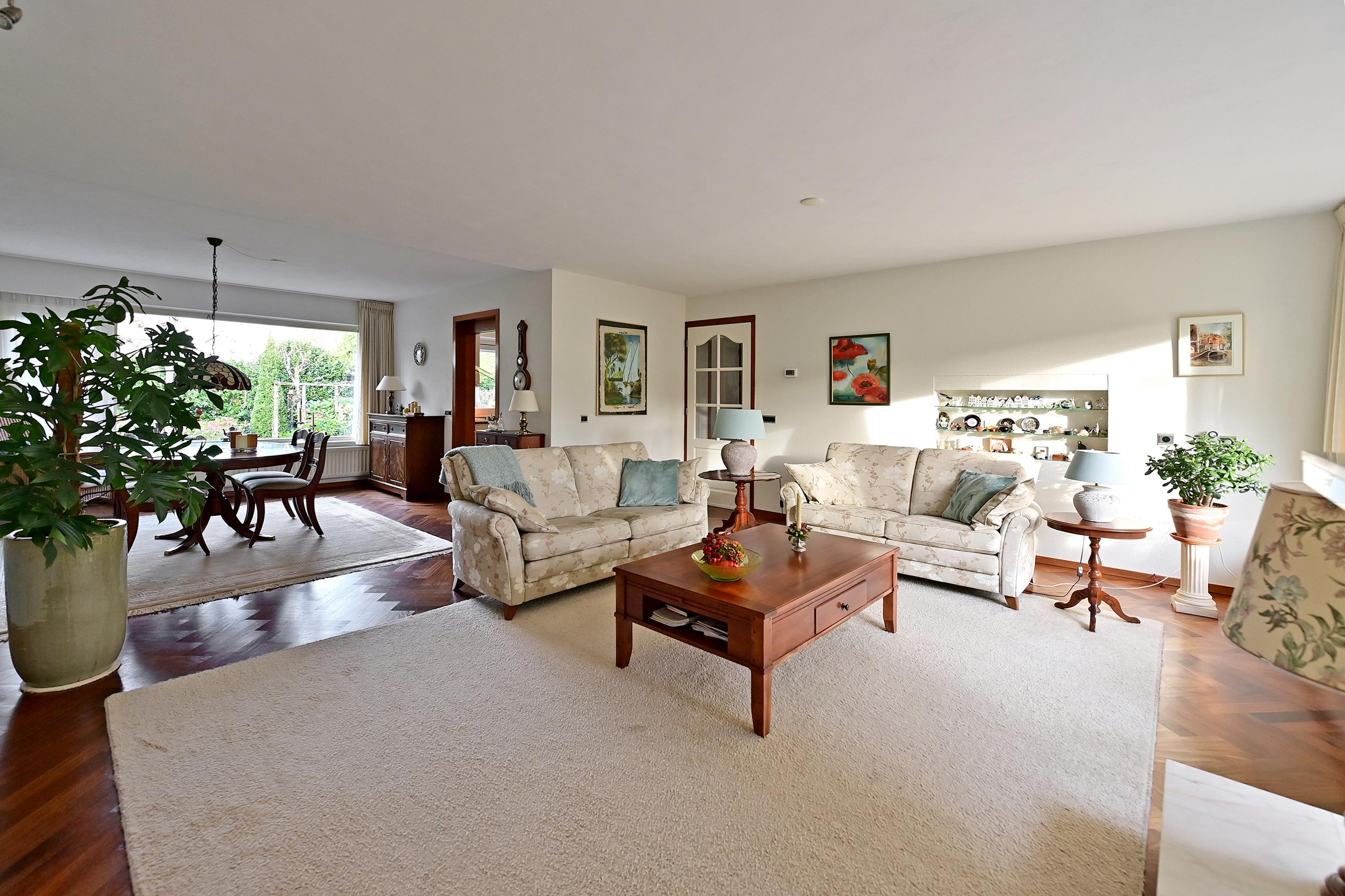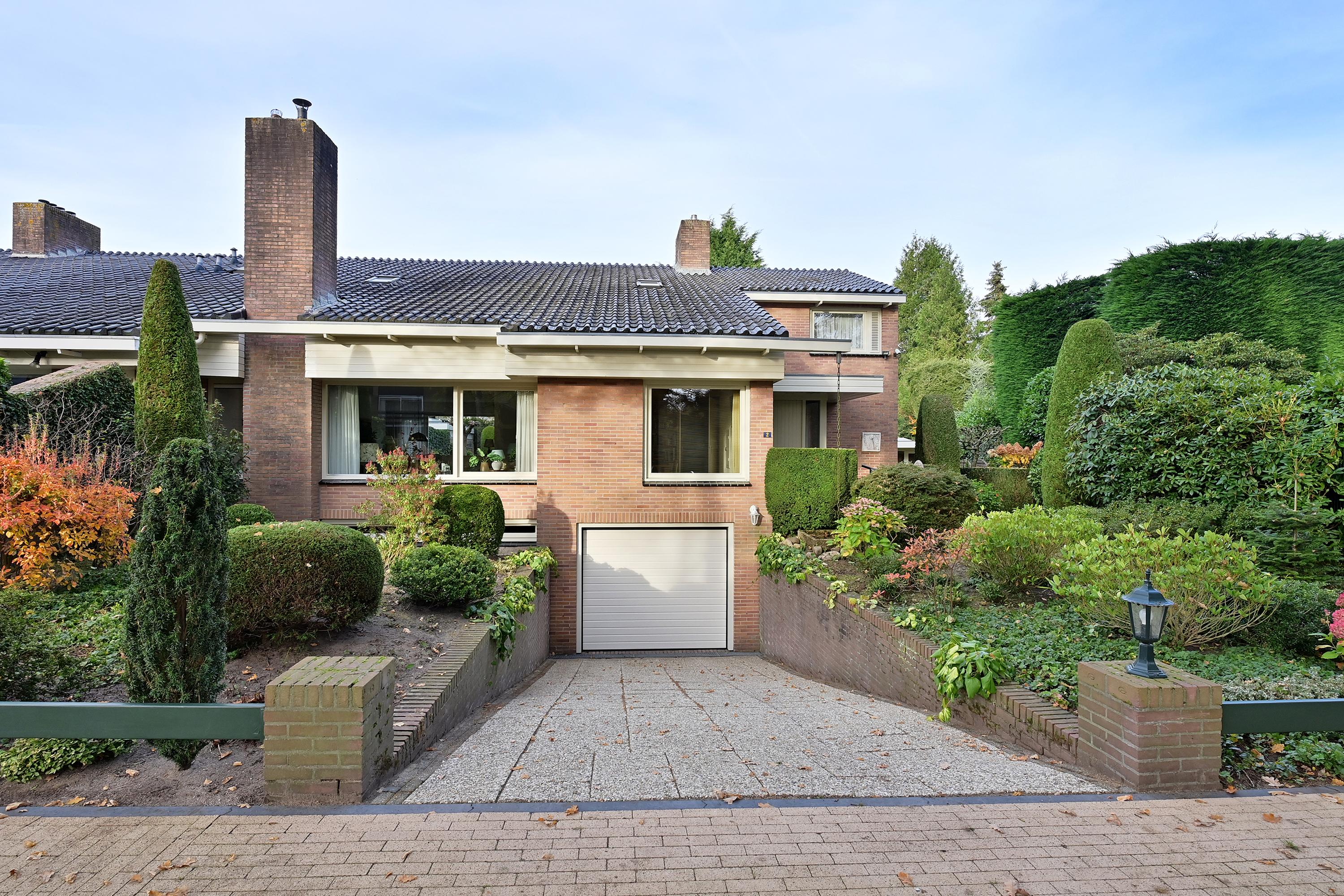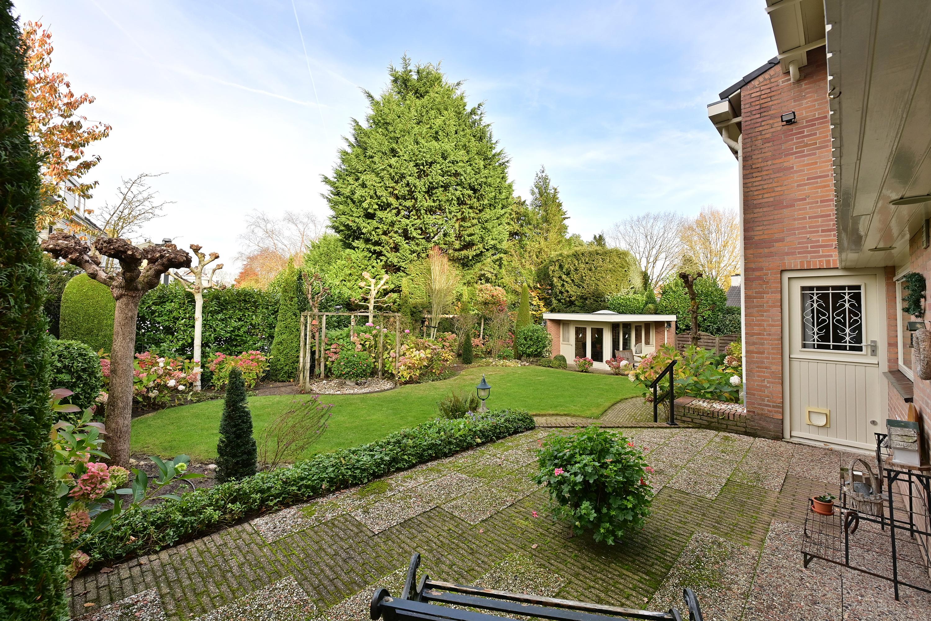De indeling omvat een ruime hal, lichte woonkamer met open haard, een praktische keuken met bijkeuken en toegang tot de tuin. Er zijn vijf slaapkamers en twee badkamers, en het souterrain bevat een hobbyruimte en garageruimte. De mooi aangelegde tuin met verschillende terrassen biedt privacy en gelegenheid om van het buitenleven te genieten.