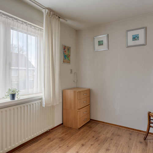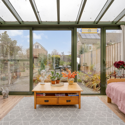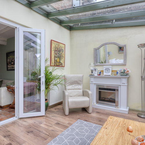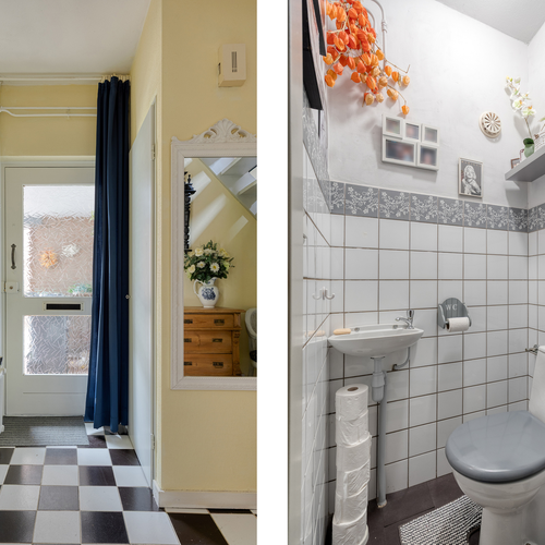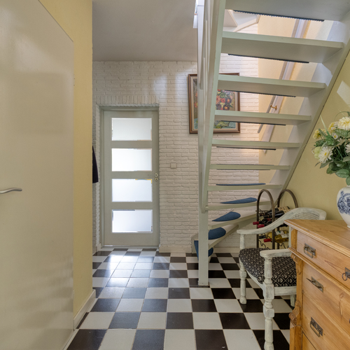 Bij binnenkomst valt de ruime entree op, die toegang biedt tot de woonkamer en de meterkast. De open indeling van woon- en eetgedeelte maakt het een sfeervolle ruimte met veel licht. Aan de voorkant bevindt zich een eenvoudige keuken, en aan de achterzijde is een serre, die kan dienen als tuinkamer en verbinding biedt met de achtertuin.