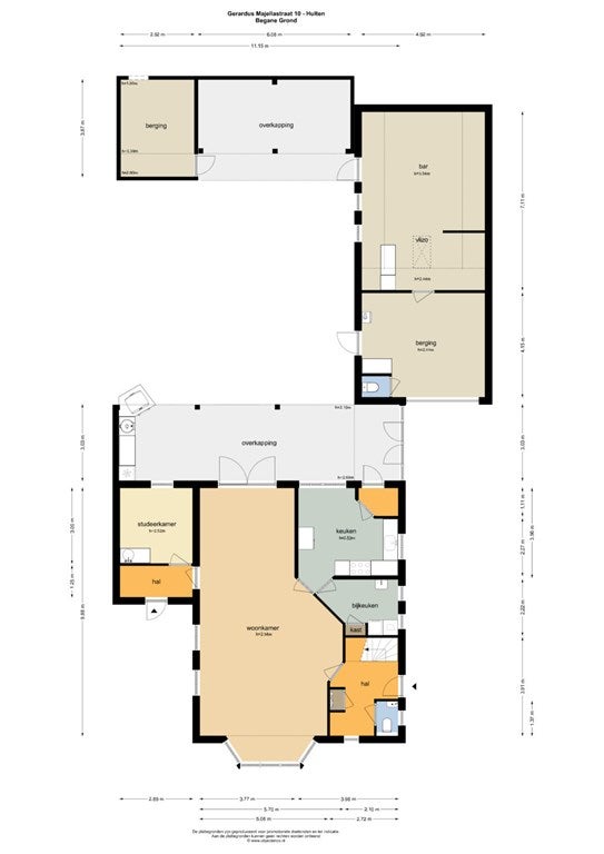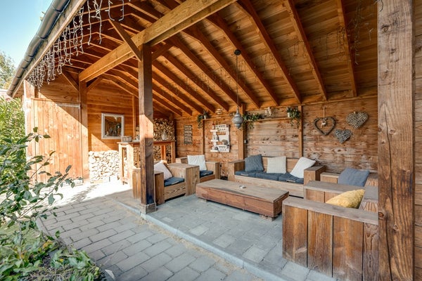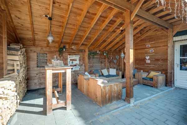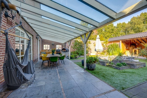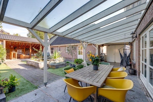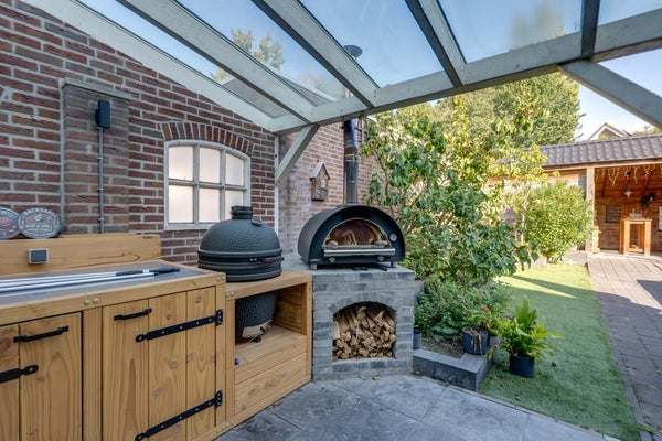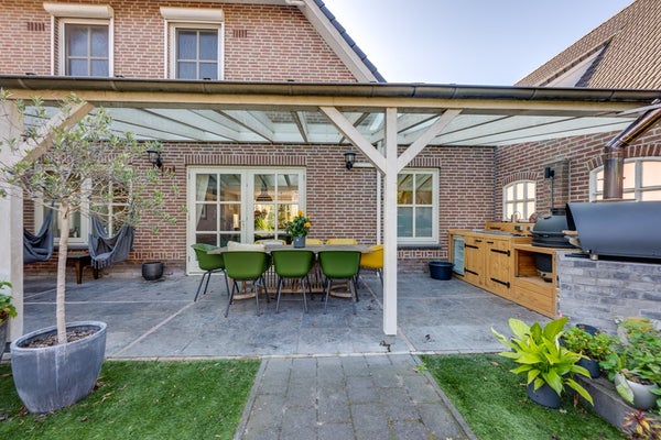 Direct achter de woning bevindt zich een brede overkapping (11,15 m. x 3,03 m.) met glazen dak compleet met buitenkeuken en v.v. elektra – perfect voor gezellige zomeravonden en de ideale plek om beschut te zitten, ongeacht het weer. Achterin de tuin staat een tweede, royale houten overkapping (6,08 m. x 3,87 m.). Daarnaast is er een houten berging (3,87 m. x 2,92 m.) aanwezig voor extra opslagruimte. De tuin is verder uitgerust met een buitenkraan en tuinverlichting, wat het geheel praktisch én sfeervol maakt.