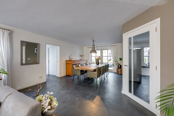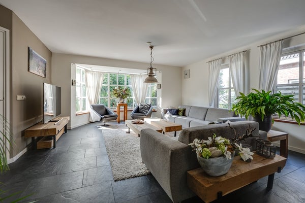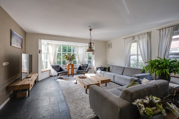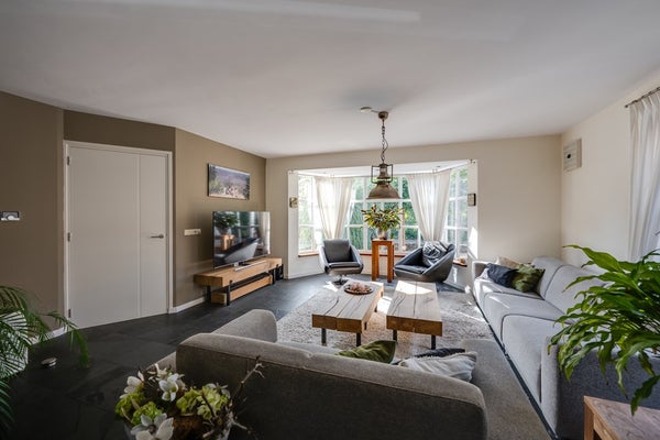 Stap binnen in een heerlijke woonkamer (9,88 m. x 5,08 m. / 3,77 m.) waar ruimte, licht en uitzicht samenkomen. Aan de voorzijde zorgt een charmante erker voor karakter én extra lichtinval vanuit het zuiden. Twee zijramen én dubbele openslaande deuren aan de achterzijde bieden niet alleen een prachtig uitzicht op het omringende groen, maar u heeft ook direct toegang tot de achtertuin.