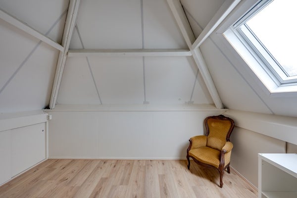 Deze kamer (3,86 m. x 3,33 m.) ligt aan de voorzijde. Aan twee zijden vindt u knieschotten voor extra bergruimte. Er is een Velux dakraam.