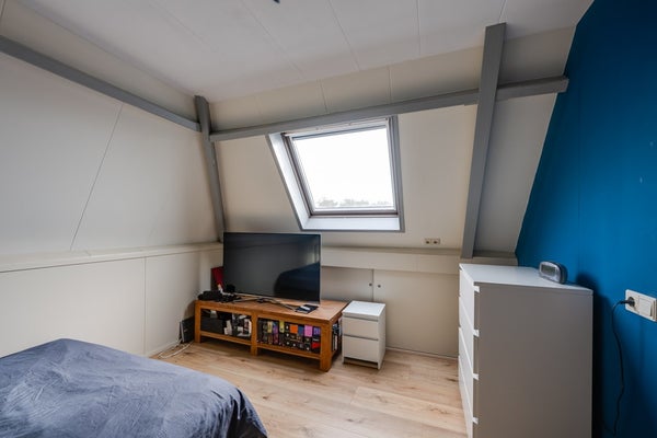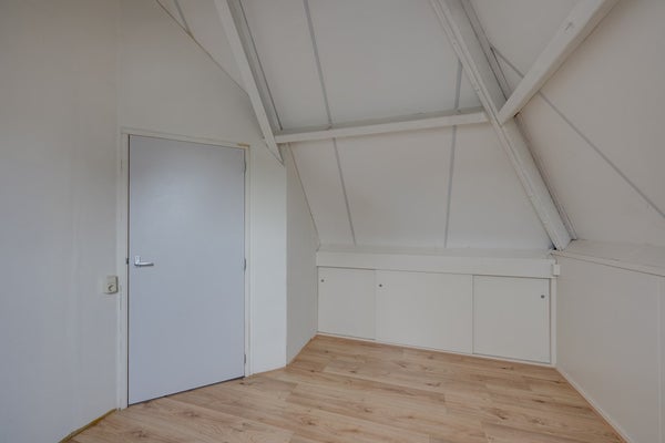 Deze kamer (3,85 m. x 3,30 m.) ligt aan de achterzijde Aan twee zijden vindt u knieschtten voor extra bergruimte. Het Velux dakraam is v.v. een verduisterend gordijn.