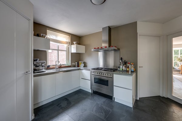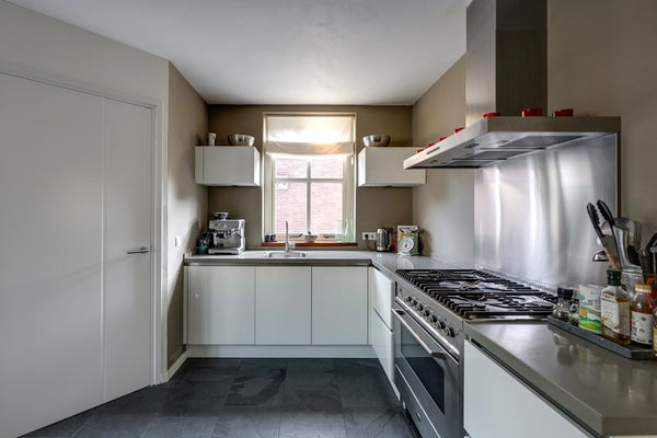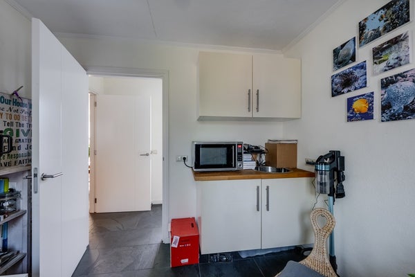 De woning (3,98 m. x 3,56 m.) beschikt over een moderne keuken in hoekopstelling. U vindt hier een gasfornuis met 5-pits gaskookplaat en oven. Een strakke RVS afzuigkap en een vaatwasser maken de keuken compleet – ideaal voor dagelijks gebruik én lekker koken. De keuken heeft een lichtgrijs composiet werkblad dat perfect combineert met de strak afgewerkte wanden en plafonds, wat zorgt voor een moderne en frisse uitstraling. Via de keuken is er directe toegang tot de praktische bijkeuken, handig voor extra bergruimte en huishoudelijke taken.