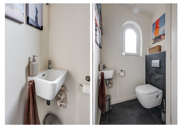 De wanden zijn deels betegeld en deels voorzien van strak stucwerk, wat zorgt voor een frisse en eigentijdse uitstraling. De badkamer is uitgerust met een ruime inloopdouche met thermostaatkraan, een dubbele wastafel en een zwevend toilet.
