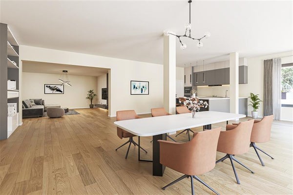 Zodra je de voordeur opent, voelt het als thuiskomen. De royale woonkamer weet meteen indruk te maken: een zee van natuurlijk licht valt binnen door de grote ramen en de openslaande tuindeuren. Hier is plek voor het hele gezin, en stel je voor hoe gezellig het is tijdens koude winteravonden – lekker uitgebreid tafelen of knus op de bank met een goed boek.
