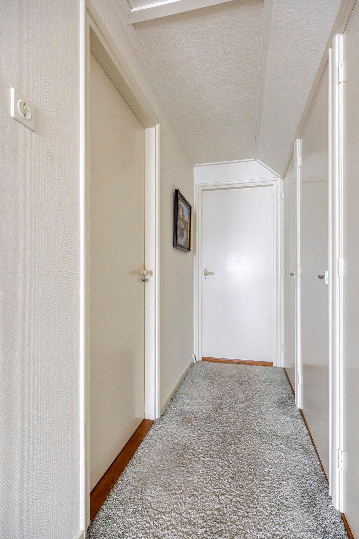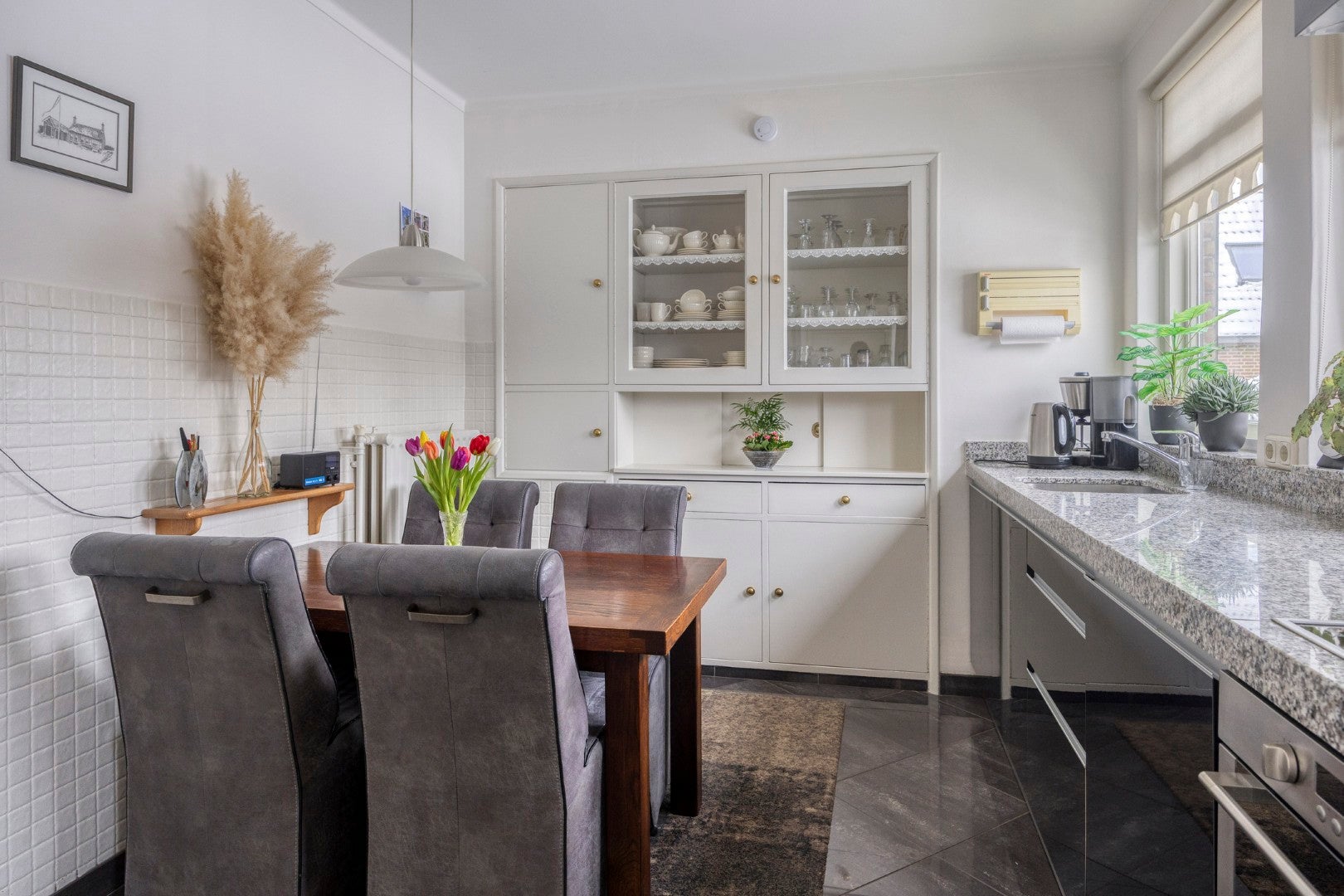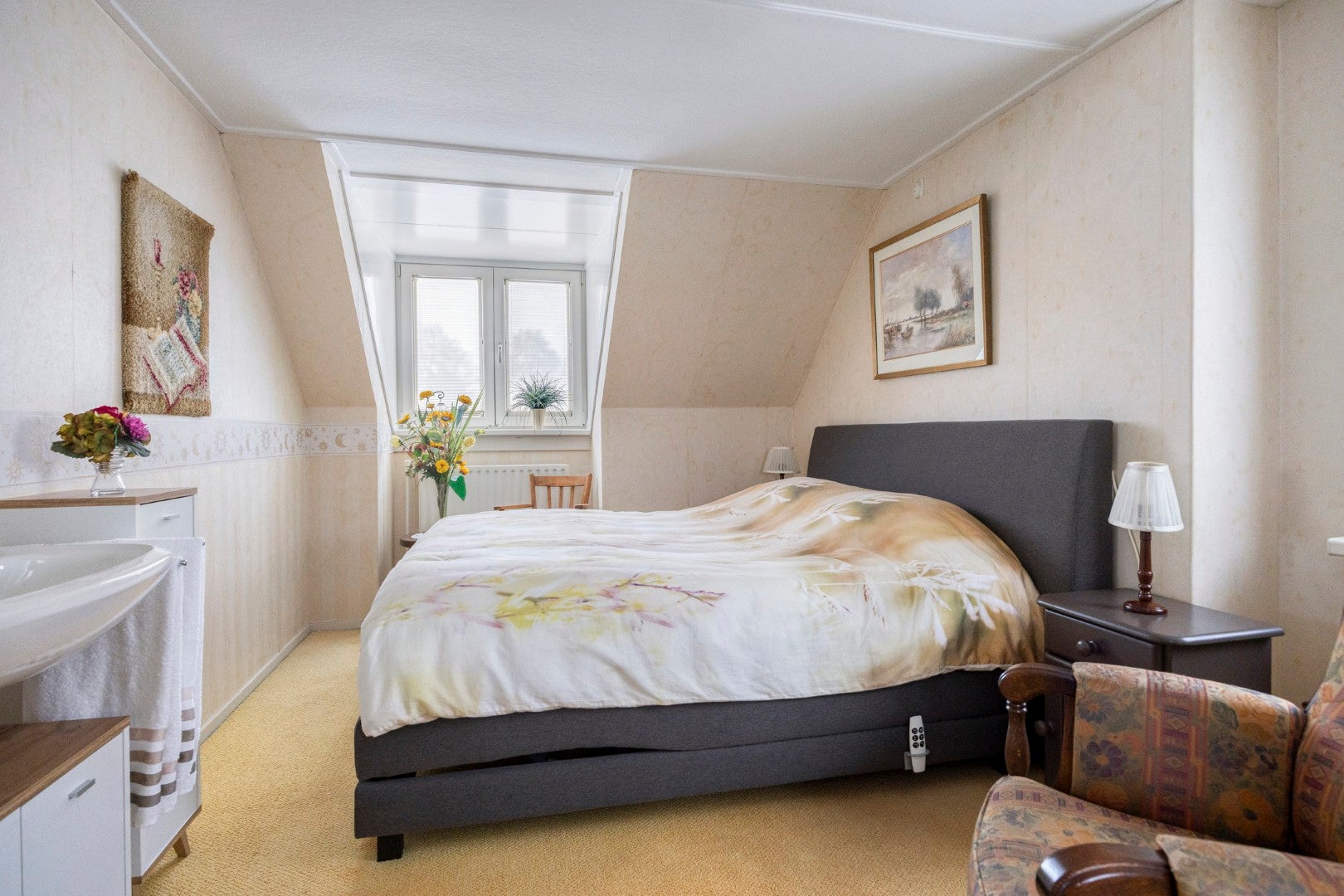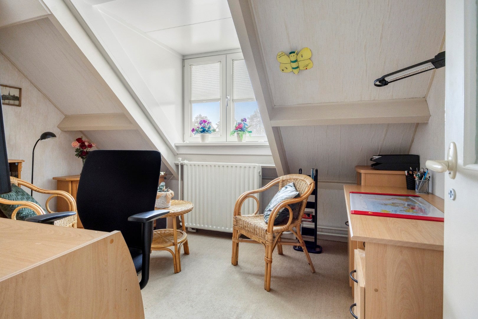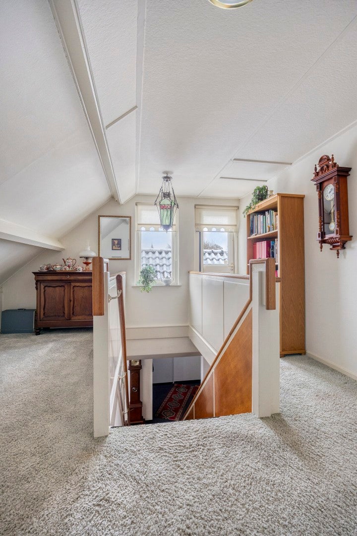 De verdieping herbergt drie slaapkamers, met kunststof dakkapellen voor extra lichtinval. De gescheiden keuken is voorzien van inbouwapparatuur, en een bijkeuken biedt extra ruimte voor een wasmachine. Vanuit de centrale hal is er toegang tot een kelder en de garage.