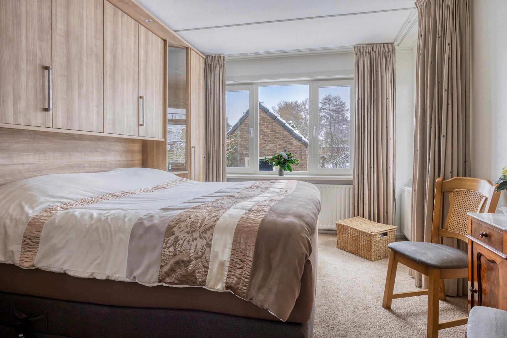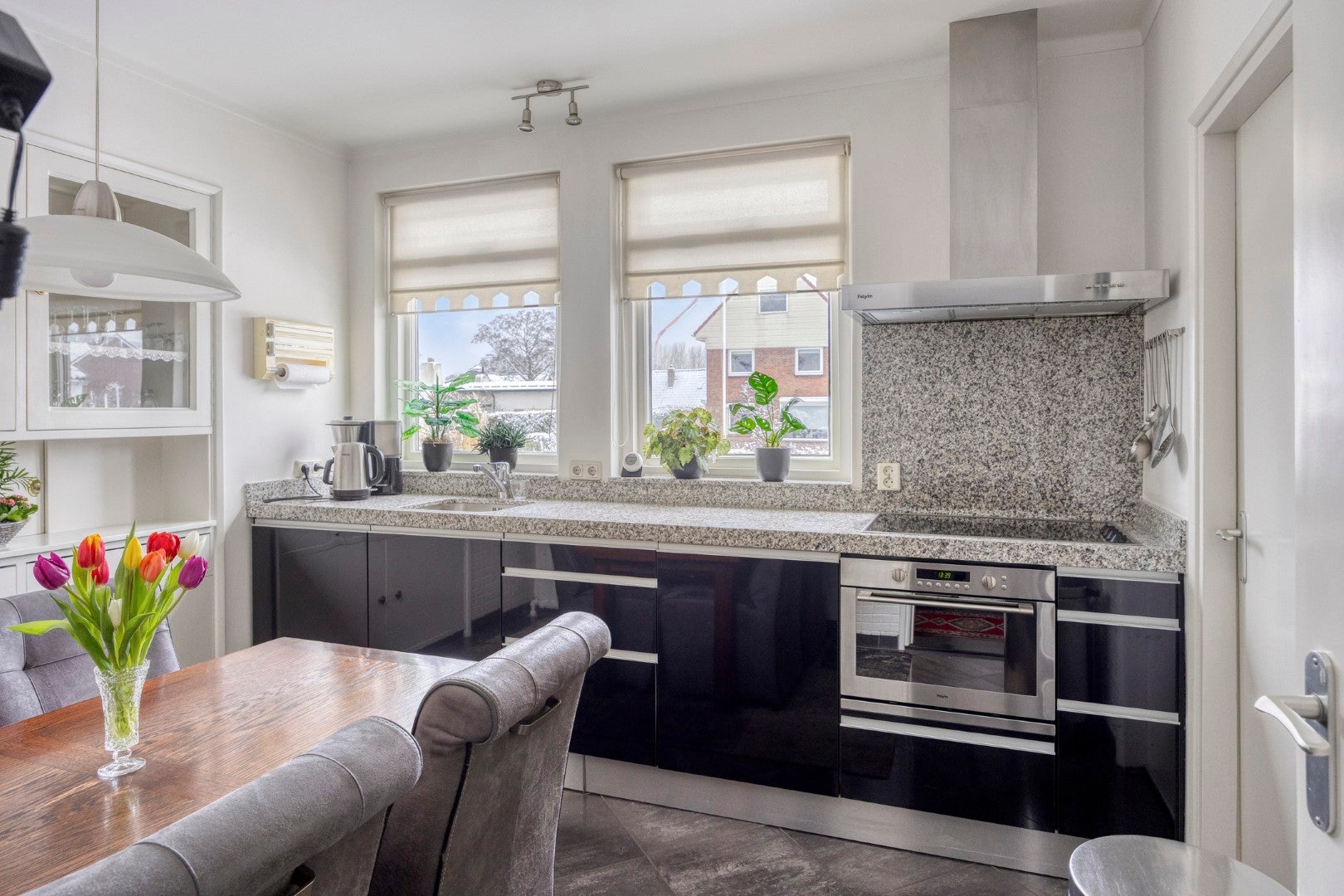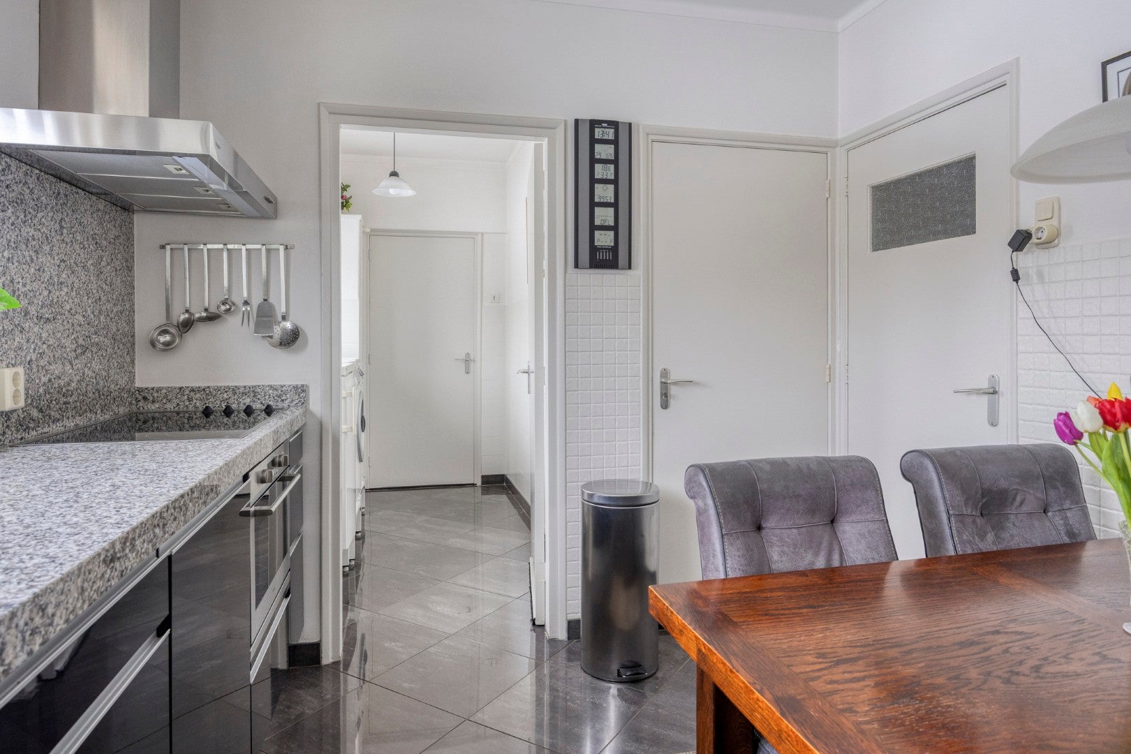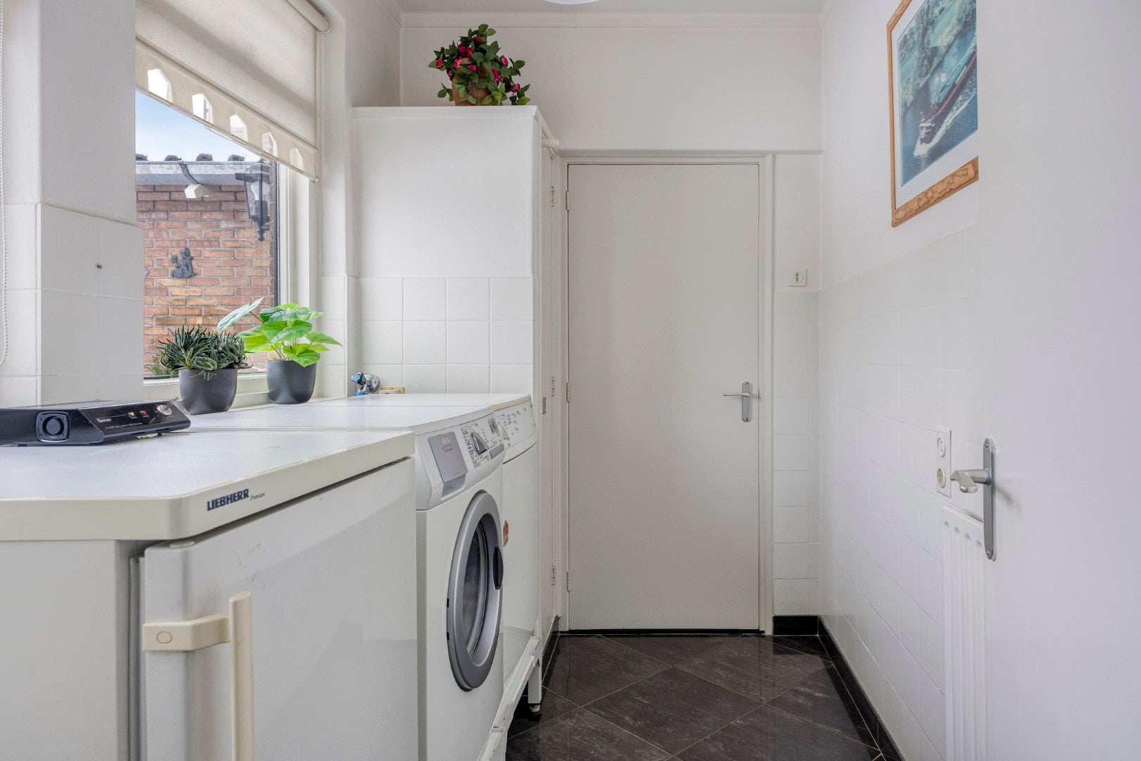 De verdieping herbergt drie slaapkamers, met kunststof dakkapellen voor extra lichtinval. De gescheiden keuken is voorzien van inbouwapparatuur, en een bijkeuken biedt extra ruimte voor een wasmachine. Vanuit de centrale hal is er toegang tot een kelder en de garage.