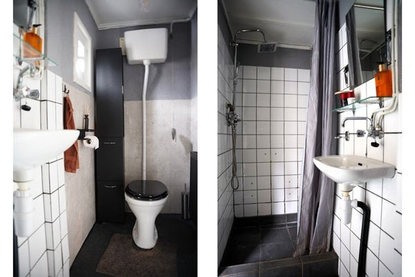 De badkamer is compact maar compleet, met een douche, wastafel en toilet.