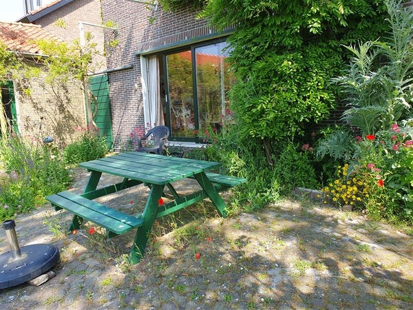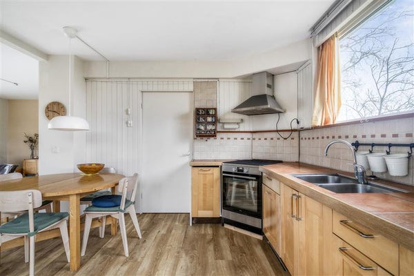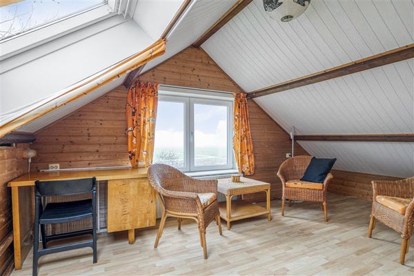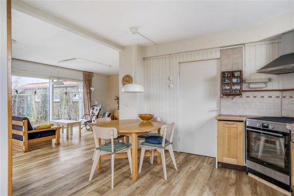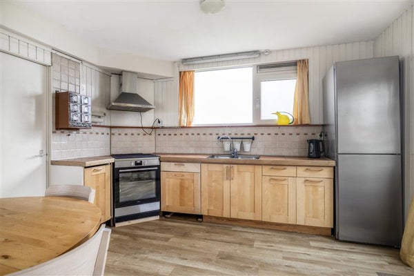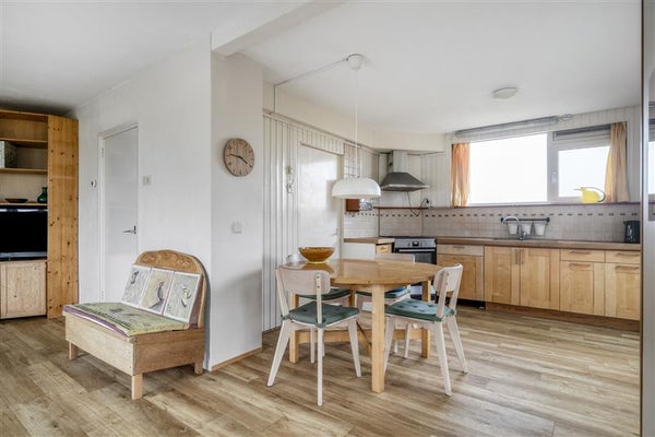 De open keuken aan de voorzijde van de woning is opgesteld in een L-vorm vormt een perfecte aanvulling op de warme leefomgeving. De keuken is al iets ouder maar wel uitgerust met moderne apparatuur zoals een elektrisch fornuis met inductiekookplaat en oven, vaatwasser, en een ruime losstaande koelkast. Terwijl je staat te koken en geniet van een gezellig gesprekje aan de eettafel, heb je direct zicht op de dijk aan de voorkant van de woning. Alle gemakken zijn aanwezig, inclusief een handige bergkast die extra opbergruimte biedt.